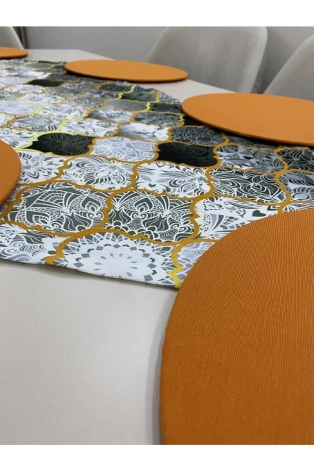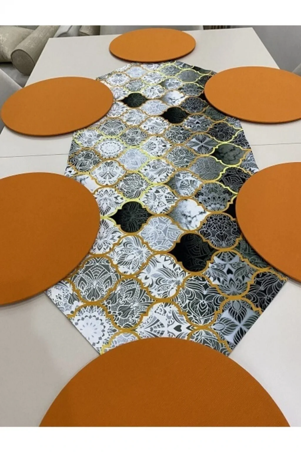 Ürün içeriği: 1 adet runner (runnerlar digital baskılı kumaştır.Boyu cmdir. ; 30 derecede makinede yıkanabilir.Tersten ütülenmesi gerekmektedir.) 6 adet supla ( 35 cm çapında 3 mm kalınlığında mdf dir. ; Supla kılıfları 1.Sınıf premier dokuma kumaş ve lastiklidir. ; Istenildiği zaman çıkartılıp yıkanabilir ve tekrar takılabilir. ; Runner kumaşı su geçirir, leke tutmaz ve yıkanabilir supla ise duck keten kumaş su geçirmez leke tutmaz ve yıkanabilen kumaşlardır.;