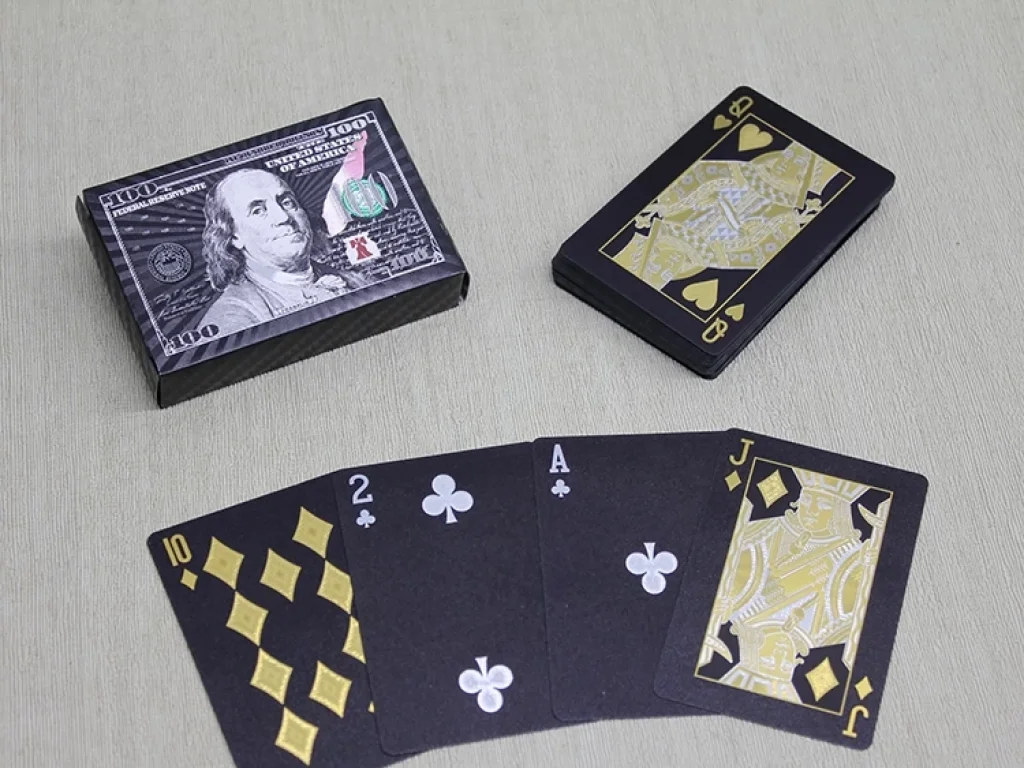 GÜMÜŞ DOLAR TASARIMLI SİYAH İSKAMBİL OYUN KARTIÜrün ÖzellikleriGümüş dolar tasarımlı siyah iskambil oyun kartı, şık ve dikkat çekici tasarımıyla oyun keyfinize farklı bir hava katıyor. 9x6 cm boyutunda üretilmiş olan bu iskambil kartları, klasik kart oyunları için idealdir. Siyah zemin üzerine gümüş ve altın detaylarla tasarlanmış özel görünümü sayesinde hem kullanımda hem de koleksiyonlarda ayrıcalıklı bir yere sahiptir. Dayanıklı yapısı sayesinde uzun süre kullanılabilir. Hem hediye olarak hem de kişisel kullanım için tercih edilebilecek özel bir tasarımdır.Paket İçeriği1 adet Gümüş Dolar Tasarımlı Siyah İskambil Oyun Kartı Destesi