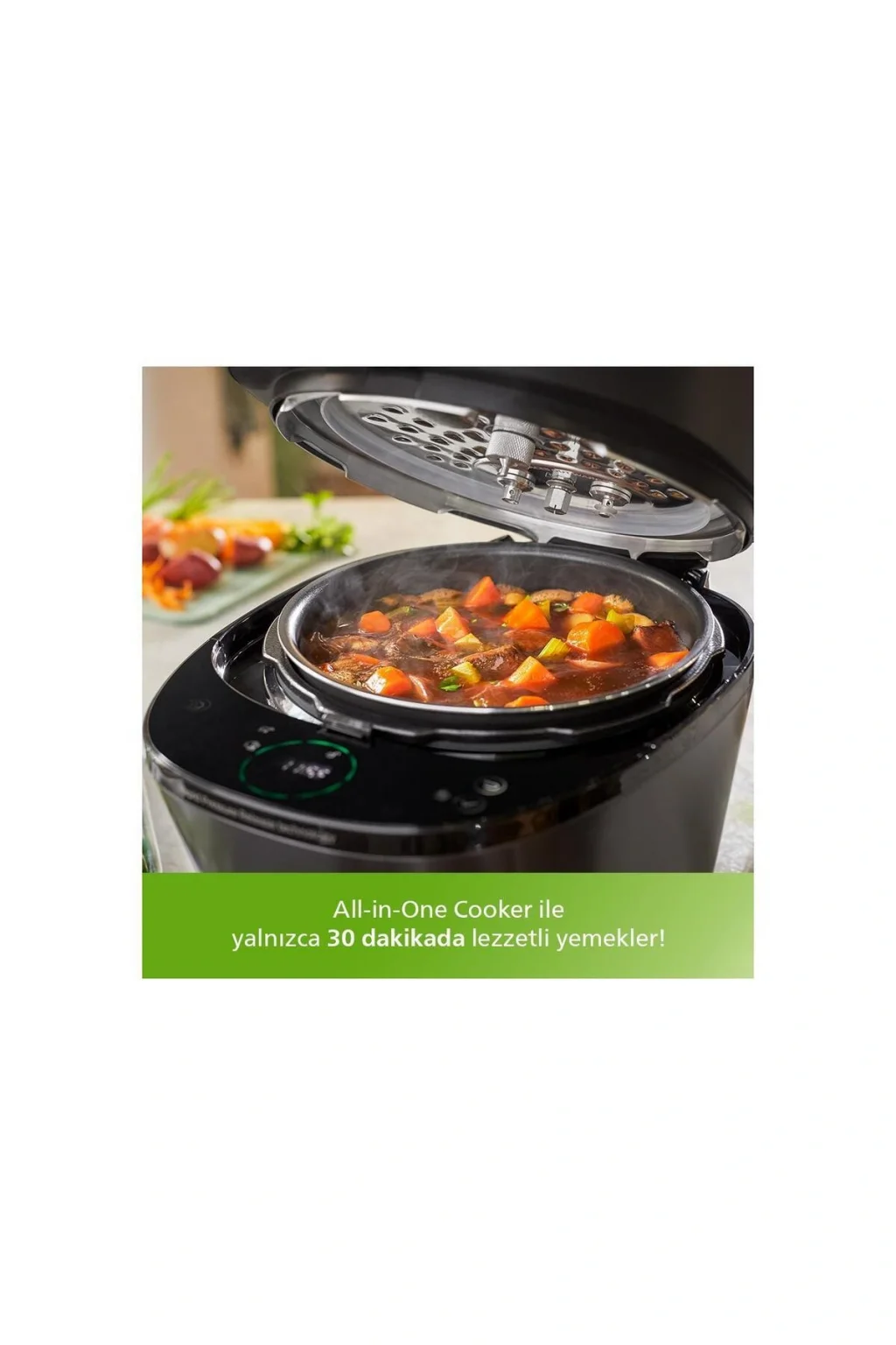 Philips HD2151/62 Çok Amaçlı Basınçlı Pişirici 5Lt All in One Cooker 30 dakikada çeşitli lezzetli yemekler pişirin Tat Kontrolü ile evde hızlı yemek pişirme deneyimini keşfedin HD2151/62 Hızlı Basınç Çıkış Teknolojisi Tat Kontrol sistemi Ön Ayarlı Pişirme Programları Adım Adım Kılavuz Hızlı Basınç Çıkış Teknolojisi Hızlı Basınç Çıkış Teknolojisi, yalnızca 7 dakikada otomatik basınç azaltma olanağı sağlar; Ocakta pişirmeye kıyasla %50 daha hızlıdır; iF Tasarım Ödülü Sahibi Tüketiciler ve tasarım topluluğu için iyi bir tasarım olduğunu belirten iF mührü, dünyanın en prestijli tasarım ödüllerinden biridir; Kompakt profiliyle modern mutfaklara uyar ve özel kullanıcı arayüzlü haznesi ekstra kullanım kolaylığı sağlar; Tat Kontrol Sistemi Yeni Tat Kontrol sistemimizle daha lezzetli sonuçlar elde edin; Hassas basınç ve sıcaklık kontrolü, et yumuşaklık oranını %22; , sululuk oranını %42; artırır; Ön Ayarlı Pişirme Programları Basınçlı pişirmeden yavaş pişirmeye, kavurmadan buharla pişirmeye kadar tek düğmeyle 35'ten fazla ön ayarlı menü seçeneğinin keyfini çıkarın; Kolay kullanım için adım adım kılavuz Adım adım ayar kılavuzu ile kullanıcı dostu arayüz, pişirme işlemini zahmetsiz hale getirir; Günlük yemek desteği için NutriU uygulaması Özel NutriU uygulamamızda, birçok günlük yemek tarifi arasında ilham veren tarifler bulabilirsiniz; 18 Koruma Sistemi Sorunsuz pişirme için 18 güvenlik koruma sistemiyle donatılmıştır; Çocuk Kilidi Dahili Çocuk Kilidi sistemi sayesinde aileniz yanınızdayken yemek hazırlamaya başlayabilirsiniz; Pişirme sırasında malzeme ekleyin Ekstra malzeme eklemek isterseniz veya tarifinizde eksik bir şey olduğunu fark ederseniz Pişirme Sırasında Malzeme Ekle düğmesine basarak dilediğiniz zaman kolayca malzeme ekleyip karıştırabilirsiniz; Daha kıvamlı ve lezzetli sonuçlar için sos yoğunlaştırma Basınç azaltıldıktan sonra Sos Yoğunlaştırma düğmesine basın; Yüksek güçlü kaynatma fonksiyonuyla artık yemekleriniz daha yoğun, daha zengin ve lezzetli; Favorilerim bölümüne 3 adede kadar özel pişirme programı kaydedebilirsiniz Favorilerim bölümünü kullanarak tek dokunuşla en sevdiğiniz yemekleri pişirebilirsiniz; Sevdiğiniz yemekleri 3 özel pişirme programına kaydedin ve Kısayol tuşuna basarak istediğiniz programı başlatın; Otomatik Basınç Azaltma Pişirme işlemi bittikten sonra basınç otomatik olarak azaltılır, bu nedenle basıncın manuel olarak boşaltılmasına veya pişirici soğudukça basıncın doğal olarak düşmesini beklemenize gerek yoktur; Ayarlanabilir pişirme uzunlukları ve pişirme basıncı seviyeleri Pişirdiğiniz her türlü yemeğe uygun farklı pişirme uzunlukları ve basınç seviyelerinin keyfini çıkarın; Ön Ayarlı Zamanlayıcı ve Sıcak Tutma fonksiyonu 24 saatlik kolay programlanabilir Ön Ayarlı Zamanlayıcı ve 12 saatlik otomatik Sıcak Tutma fonksiyonuyla yemeklerinizi her zaman optimum düzeyde ısıtabilir ve dilediğiniz zaman yiyebilirsiniz;