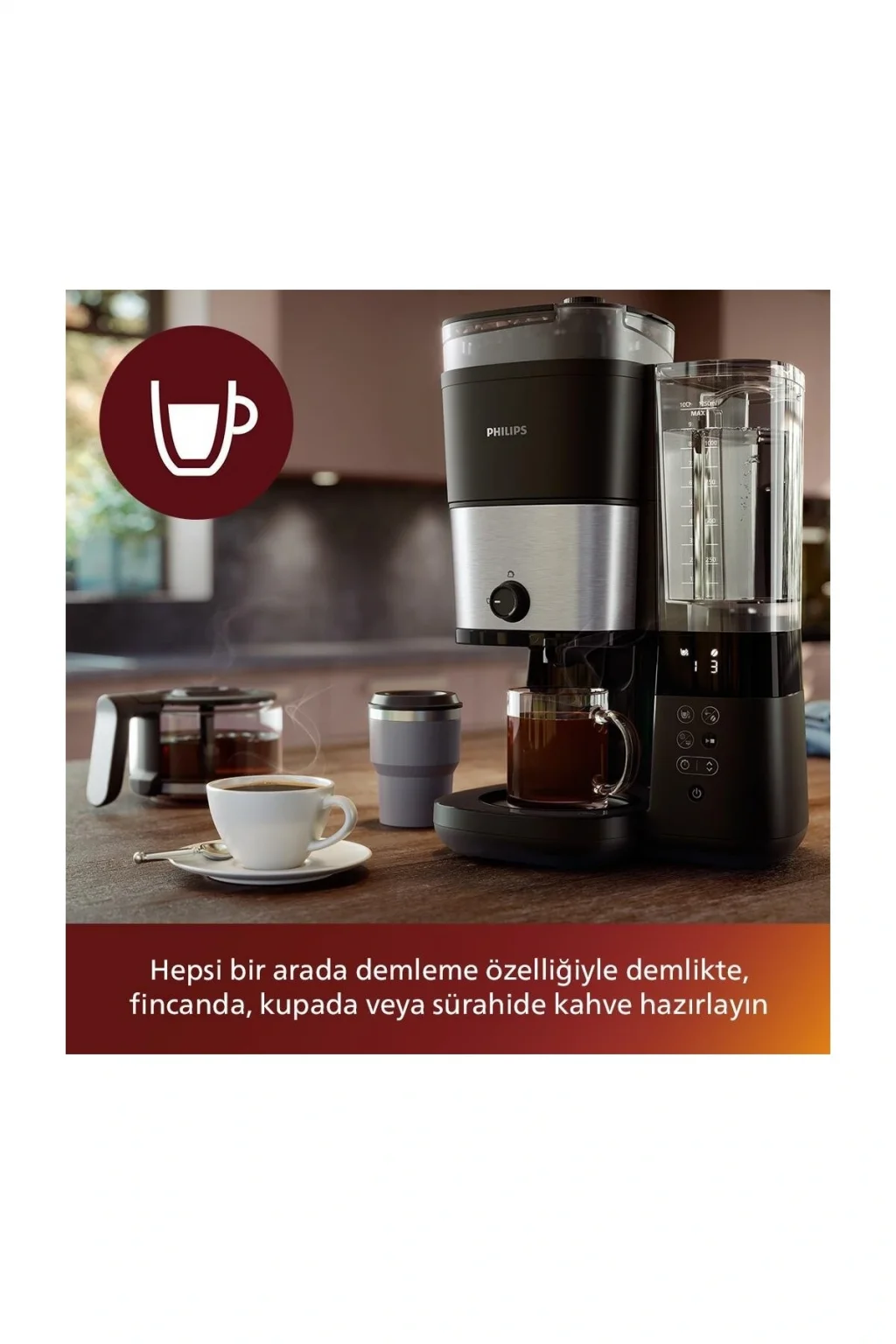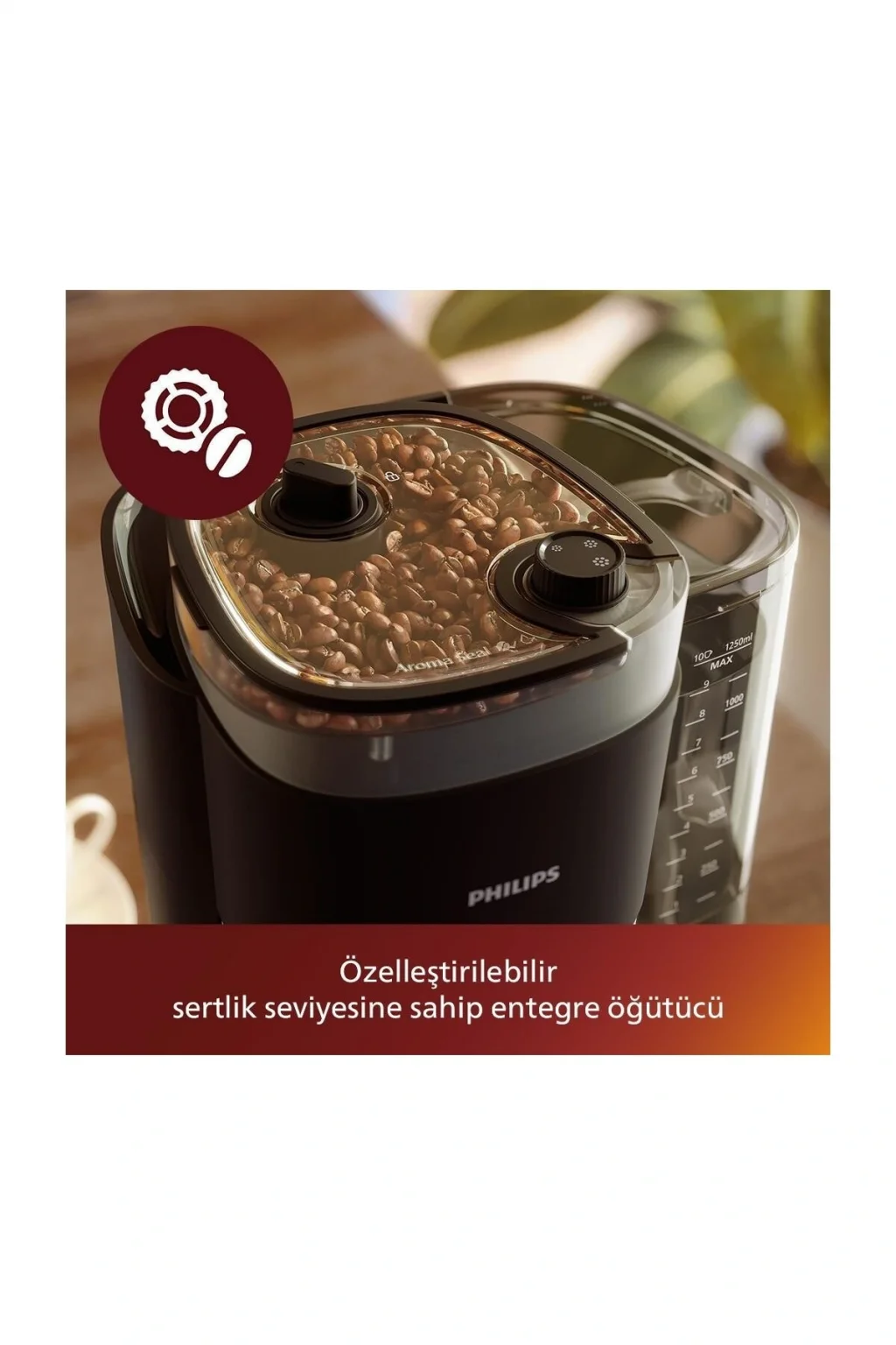 Her fincanda taze kahve aroması.; Yapması keyifli, içimi enfes bir lezzet.; Taze çekirdeklerle yapılmış nefis bir kahve: Bir demlik kahveyle ailenizi uyandırabilir veya öğleden sonra bir mola vermek için en sevdiğiniz kupada kahvenizi hazırlayabilirsiniz.; Siz yoğunluğu seçin, makineniz doğru sıcaklıkta mükemmel bir kahve için tam gerektiği miktarda su alsın.; Entegre öğütücülü ikili kahve çekirdeği haznesi • Özelleștirilebilir sertlik seviyesine sahip entegre öğütücü • Kahve çekirdeklerinizi karıștırmak ve değiștirmek için çıkarılabilir ikili kahve çekirdeği haznesi Hepsi Bir Arada Zahmetsiz Otomatik Kahve Demleme • Hepsi bir arada demleme özelliğiyle demlikte, fincanda*, kupada* veya sürahide** kahve hazırlayın • Akıllı Akım Ölçer: Her demde mükemmel su-kahve oranı • Damla durdurma özelliği, demleme tamamlanmadan bir fincanı doldurmanızı sağlar • Maksimum 10 fincan kapasiteli, çıkarılabilir su haznesini kolayca doldurun Tam istediğiniz gibi • Yaz günlerinde ferahlamak için buzlu kahve hazırlayın • Yerden tasarruf sağlayan tasarım, mutfak tezgahıyla dolap arasına sığar • LED ekran ile kahve deneyiminizi istediğiniz gibi kișiselleștirin • Kahve makinenizin kahve yapmaya bașlayacağı zamanı programlayın • Mükemmel bir lezzet için aroma karıștırıcı • Otomatik kapanma ve sıcak tutma ișleviyle ekonomik ve güvenli Ürün özellikleri Güç (W) 1000 Otomatik Kapanma Var Kahve Öğütücü Var Renk Siyah Su Isıtıcı Kapasitesi (ml) 1000 Cam Hazne Var Su Seviyesi Göstergesi Var Fincan Kapasitesi 1 Damlama Emniyeti Var