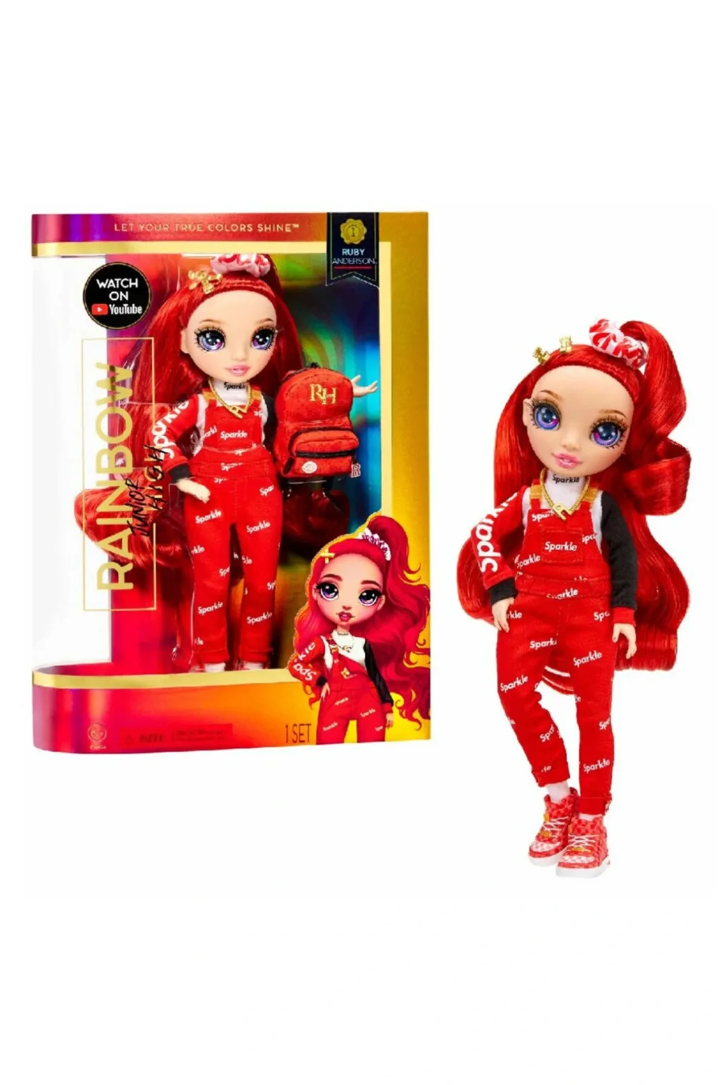 Rainbow High Jr.; Ruby Anderson S1 Özellikleri; En sevdiğiniz Rainbow High bebeklerinin genç versiyonlarıyla gerçek rengin parlasın! Rainbow High karakterlerimizin Rainbow High öğrencisi olmadan önce yaratıcı tutkularını nasıl bulduklarına dair kendi köken hikayeleri var.; Bu hikayeleri keşfetmeye hazır mısın ? Ruby, büyük şehir hayalleri olan küçük bir kasaba kızıdır! Uzun kollu, ışıltılı üst, altın tokalı sevimli kırmızı tulum, kareli yüksek bilekli spor ayakkabı ve okulunun temel aksesuarlarıyla Ruby'nin tarzını keşfet ! Ruby genç yaştan beri yaratıcılığı ile ön plana çıkmaktadır.; Eski modalara yeni stil vermenin yollarını aramayı her zaman sevmiştir.; Ruby Anderson bebeği, tepeden tırnağa Ruby'nin imzası olan KIRMIZI renk kıyafetleriyle, muhteşem bir yüz yapısına sahip, güzel uzun kızıl saçları, uzun kirpikleri ve cam gözleri olan mükemmel bir Rainbow High bebeğidir.; Sürpriz yok, özel sırt çantası alev alev yanıyor ! Özel tasarlanmış, RH altın işlemeyle açılıp kapanan yumuşak kumaştan kırmızı bir sırt çantasıyla geliyor.; Işıltılı saten saç lastiğini, iki altın saç tokasını ve R kolyesini saklamak için mükemmel bir aksesuarı bulunuyor.; Rainbow High bebeklerin daha genç versiyonu.; 23 cm boyunda bir adet bebek.; Yeni genç yüz yapısı.; Sevimli ve güzel, tamamen eklemli bebekler.; İmza renginde, benzersiz kıyafet.; Fırçalanabilir uzun saçlar,saç aksesuarları ve tarak.; Oyuncak bebek oyun seti şunları içerir: Bir adet RH Junior High bebeği ve kıyafeti, bir çift oyuncak bebek ayakkabısı, bir çift çorap ve bebek aksesuarları - açılıp kapanan yumuşak kumaş sırt çantası, bir çift kelebek saç tokası ve oyuncak bebek tarağı.; Yaş Grubu: +3..