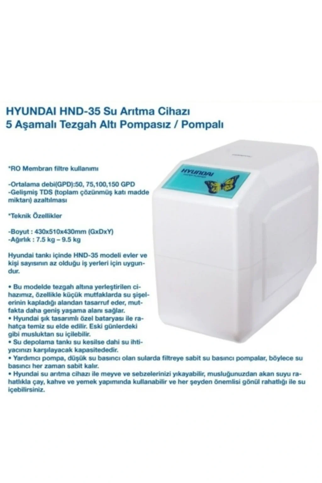 Avantajları: Berraktır. ; İçinde tortu bulunmaz. ; Pas, çamur, asbest gibi borulardan geçen tanecikler olmaz. ; Kokusuzdur. ; Klor ve suya kötü koku ve kötü tat veren kimyasal karışımlar içermez. ; Sağlıklıdır. ; Herhangi bir mikro organizma barındırmaz. ; Arsenik, nitrit, kurşun, cıva, asbest veya bunların karışımları içermez. ; Kalitelidir. ; İçinde standartlar nispetinden 40mg/lt den daha az çözünmüş madde bulunduğu için içmeye uygun kalitededir. ; Yumuşaktır. ; Çok az miktardaki kalsiyum ve magnezyum iyonları sayesinde en çok tercih edilen kaynak sularına benzer. ; Tazedir. ; Şelale suyu gibi bol miktarda oksijen içerir. ; Uzun süre beklemediği ve hep yenilendiği için tazedir. ; Ekonomiktir. ; Damacana veya pet şişe sularla kıyaslandığında neredeyse bedavaya gelir. ; Zahmetsizdir. ; Damacana taşıma sorunu yoktur. ; Musluğu açmak yeterlidir. ; Lezzetlidir. ; Yemeklerinizin, çayınızın tadının ne kadar değiştiğine inanamayacaksınız! Şık Durur. ; Tezgahınızın altında yer kaplamaz ve çok şık durur. ; I. ; Aşama: Sediment Filtre (5micron) II. ; Aşama: GAC Karbon Filtre III. ; Aşama: CTO Karbon Filtre IV. ; Membran: 80 GPD V. ; Aşama: TCR Post Karbon Filtre Pompa: Yok Musluk: Lüx Musluk Renk Seçenekleri: Beyaz- Siyah/Beyaz Ürün Genişliği: 25 cm Ürün:Derinliği: 45 cm Ürün Yüksekliği: 40 cm Ürün Ağırlığı: 9,5 kg Tank Kapasitesi: 8 Litre Ek Bağlantı: Çay Ocağı, Kahve Makinesi, Diğer Garanti Süresi: 24 Ay - 120 Ay Parça Bulundurma Ph: 7-8,5pH Filtre Değişim Periyodikleri I,II,III Filtre 10.Ay - IV,V Filtre 24. ; Ay;