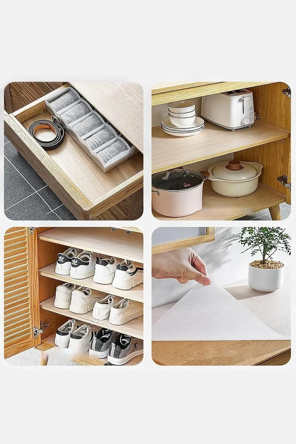 - Pratik kaydırmaz raf örtüsü ile dolaplarınızı düzenli tutabilir, eşyalarınızın kaymasını engelleyebilirsiniz. - 45 cm genişliği ve 3 metre uzunluğuyla geniş bir alana kolayca uygulanabilir. - Mutfak, dolap içi veya buzdolabı gibi farklı alanlarda kullanabilirsiniz. - Ev düzenleyici organizerler kategorisinde yer alan bu ürün, dolap içi düzenlemenize pratik bir çözüm sunar. - Kaydırmaz özelliği sayesinde eşyalarınızı sabit tutar ve düzeninizi korur. - Kolay temizlenebilir yapısıyla hijyenik bir kullanım sunar. - Çok amaçlı kullanımıyla evinizde daha fazla düzen ve pratiklik sağlar. - Yüksek kaliteli malzemeden üretilmiştir, dayanıklı ve uzun ömürlüdür. - Ürün, evinizin her alanında düzen sağlamanıza yardımcı olacak şık ve kullanışlı bir çözümdür.