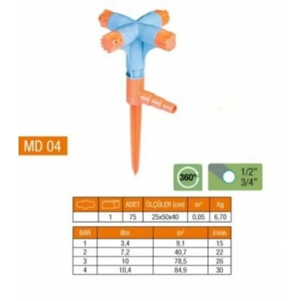 4 YÖNLÜ & NORMAL SPRİNK FISKİYE (KISA MEME)Ürün Özellikleri4 yönlü ve normal sprink fıskiye, kısa memeli tasarımıyla bahçe ve çim alanlar için etkili ve dengeli sulama sunar. 360 derece dönebilen yapısı sayesinde suyu tüm yönlere eşit şekilde dağıtır. 1/2” ve 3/4” hortum çaplarıyla uyumlu bağlantısı sayesinde farklı hortum sistemlerine kolayca entegre edilebilir. Yüksek basınçta dahi dengeli performans gösteren bu ürün, sağlam plastik malzemeden üretilmiştir ve dış mekâna dayanıklıdır. 25x50x40 cm ölçüsündeki bu model, özellikle geniş alanlarda sulama ihtiyacına pratik bir çözüm sunar. Farklı bar seviyelerinde ortalama 3,4 ila 10,4 metreye kadar püskürtme mesafesi sağlar. Kurulumu ve kullanımı son derece kolaydır. Bahçeler, sebze alanları ve peyzaj uygulamaları için uygundur.Paket İçeriği1 Adet 4 Yönlü & Normal Sprink Fıskiye (Kısa Meme)