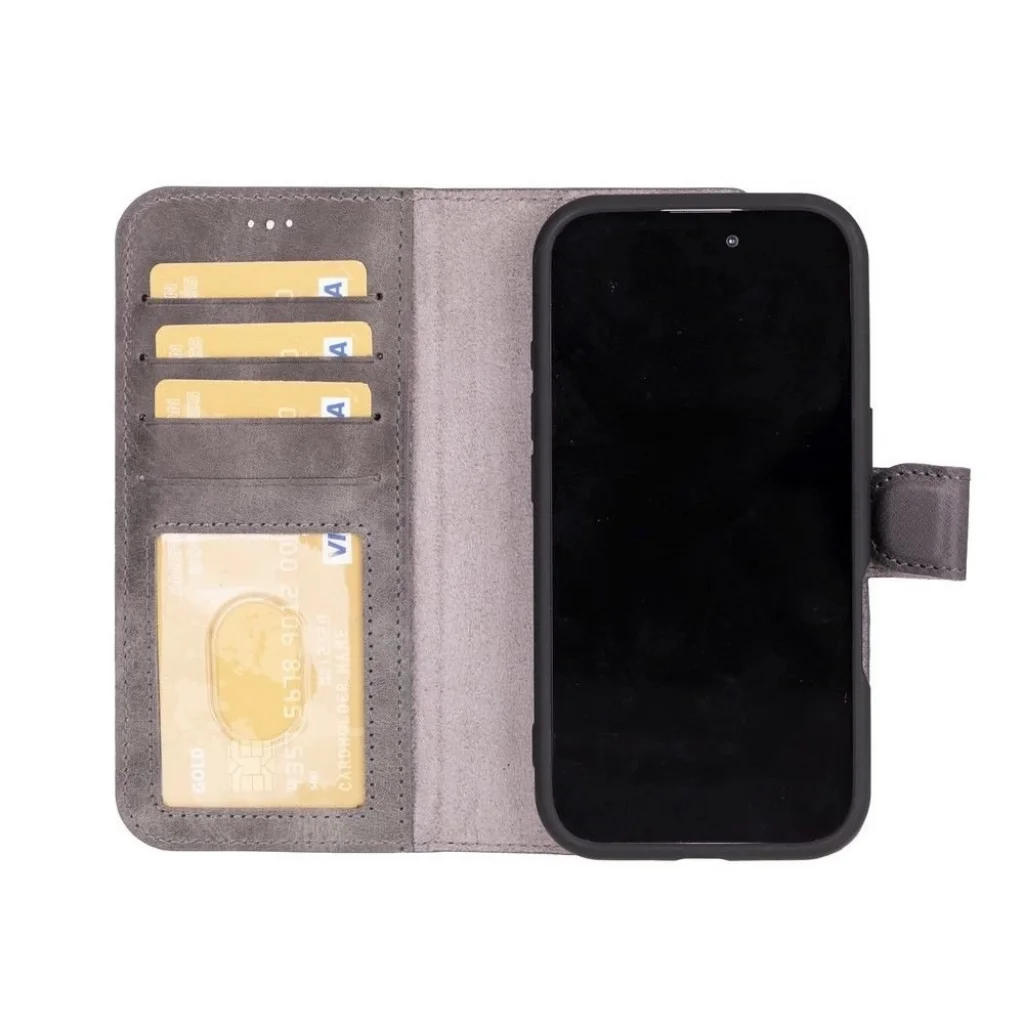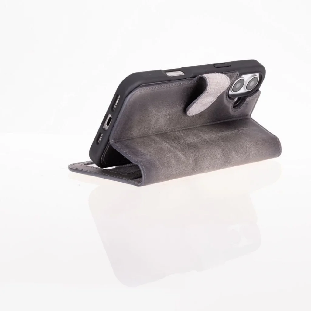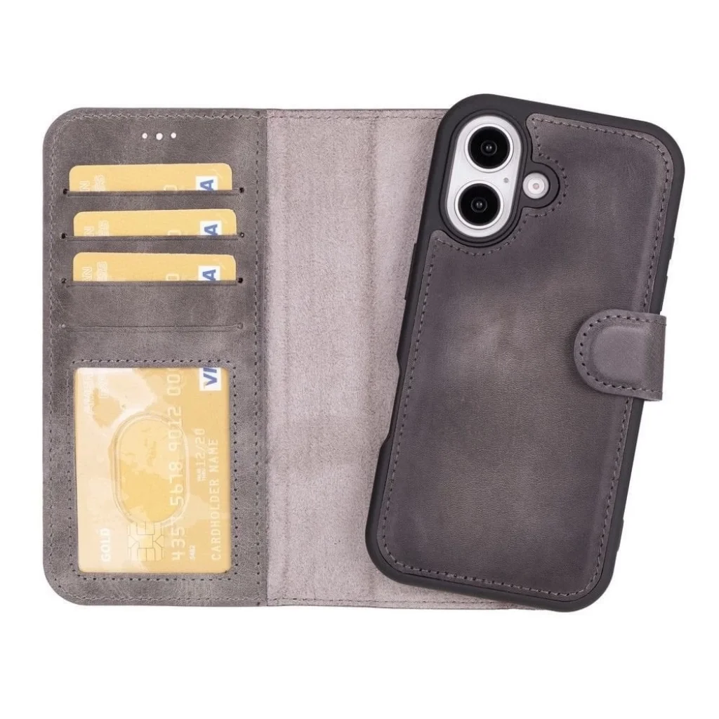 Apple iPhone 16 Plus uyumlu, Hakiki Deri, El Yapımı, Cüzdanlı Kılıf, Gölgeli Gri