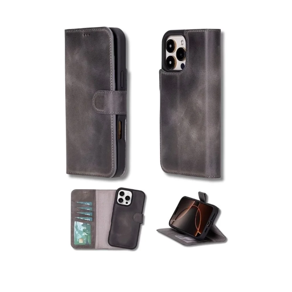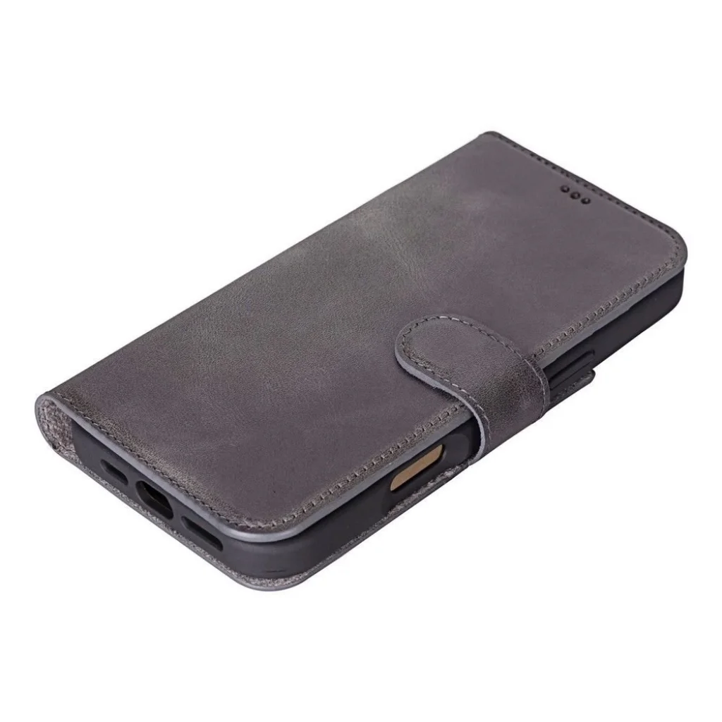 Apple iPhone 16 Pro uyumlu, Hakiki Deri, El Yapımı, Cüzdanlı Kılıf, Gölgeli Gri