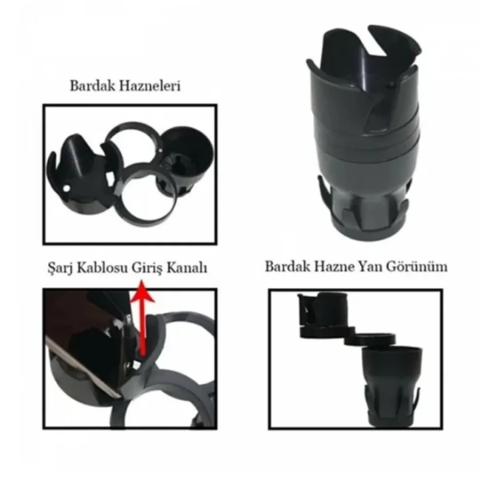 AYARLANABİLİR ARAÇ İÇİ ÇOKLU BARDAK TUTACAĞIÜrün ÖzellikleriAraç içi düzeninizi kolaylaştıran ayarlanabilir çoklu bardak tutacağı, döner yapısı sayesinde aynı anda birden fazla içecek, telefon veya küçük eşyayı yerleştirmenize olanak tanır. Araç bardaklık yuvasına yerleştirilen bu ürün, dönebilen hazneleri ile pratik kullanım sunarken farklı boyutlardaki içecek şişeleriyle de uyumludur. Alt bölümdeki kanal sayesinde kablo geçişi sağlanabilir ve şarj cihazları rahatlıkla kullanılabilir. Dayanıklı plastik malzemeden üretilmiş olan bu ürün, uzun süreli kullanım için idealdir ve araç içindeki dağınıklığı minimuma indirir. Siyah rengiyle her araç tasarımına uyum sağlar.Paket İçeriği1 adet Ayarlanabilir Araç İçi Çoklu Bardak Tutacağı