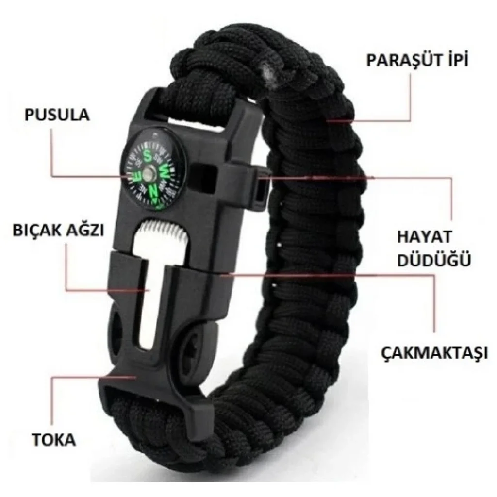 ÇOK AMAÇLI HAYATTA KALMA BİLEKLİĞİBileklik günlük hayatta dekorasyon olarak rahatça kullanılabilir.Bileklik hayat kurtarıcı, acil bir durumda kullanılabilen düdük, çakı, çakmaktaşı, pusula ve paraşüt ipi olarak kullanıma uygundur. Kamp, botla, av, yürüyüş vb. Için harika. Bu ip, çok fazla güç ve dayanıklılık gerektiren her şey için kullanılabilir.Paket İçeriği1 adet çok amaçlı hayatta kalma bilekliği