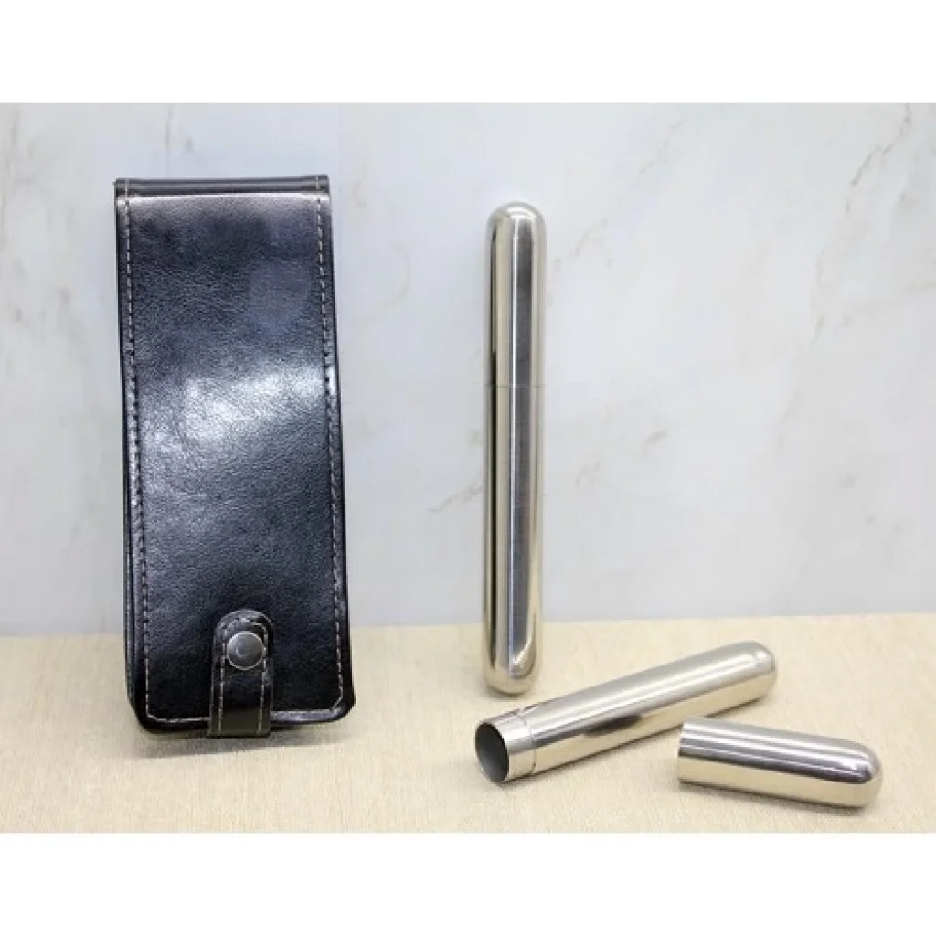 DERİ KILIFLI İKİLİ PASLANMAZ ÇELİK PURO TÜPÜÜrün ÖzellikleriDeri kılıflı ikili paslanmaz çelik puro tüpü, puro severler için şık ve pratik bir üründür. İki puroyu güvenli bir şekilde taşımanızı sağlar. Paslanmaz çelik malzeme ile dayanıklıdır, uzun ömürlü kullanım sunar. Deri kılıfı, hem estetik hem de taşıma kolaylığı sağlar. Bu puro tüpü, şık tasarımı ile hem işlevsel hem de dekoratif bir aksesuardır. Puroyu nemden, tozdan ve hasardan korur. Taşıması oldukça kolay ve pratik olan bu ürün, puro meraklılarının vazgeçilmezi olacaktır.Paket İçeriği1 Adet Deri Kılıflı İkili Paslanmaz Çelik Puro Tüpü