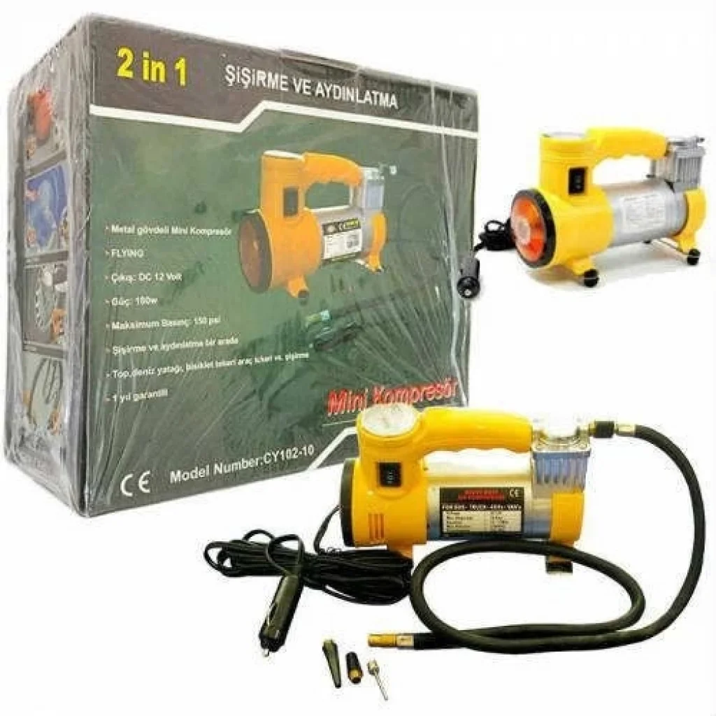 Trafiğe çıkmadan, spor aktivilerinde, tatil günlerinde vb. durumlarda hayatını kolaylaştıracak Hava Kompresörü.Sabah uyandığınızda arabanızın lastiği inmiş olabilir ya da uzun yolda lastiğiniz patlayabilir.Yapmanız gereken sadece aracınız çalışırken aracınızın çakmak girişine Hava Kompresörü'nü bağlayarak lastiğinizi şişirmek.Artık el pompası ile saatlerce süren şişirme işlemlerine vakit ayırarak zaman kaybetmeyecek ve yorulmayacaksınız.150 PSI Hava Kompresorü ile saniyeler içerisinde yorulmadan, zaman kaybetmeden şişirme işlemlerini yerine getirebilirsiniz.Şişme yataklar, araç lastikleri, top, bisiklet lastiği, balon vb. birçok ürünü Hava Kompresörü Mini Şişirme ve Aydınlatma Araç Lastik Pompası ile kolayca şişirebileceksiniz.Hava Kompresörü Mini Şişirme ve Aydınlatma Araç Lastik Pompası Özellikleri:150 PSI hava basınç gücüne sahiptir.12 volt çakmaktan enerji alabilir.3 adet farklı şişirme aparatı vardır. Kutusu bulunmaktadır. Aracınızda fazla yer kaplamayan kompakt tasarıma sahiptir. Kullanımı oldukça basittir.Bu eşsiz ürünü yıllarca kullanabilir, hemen hemen her işinizi de rahatlıkla görebilirsiniz.