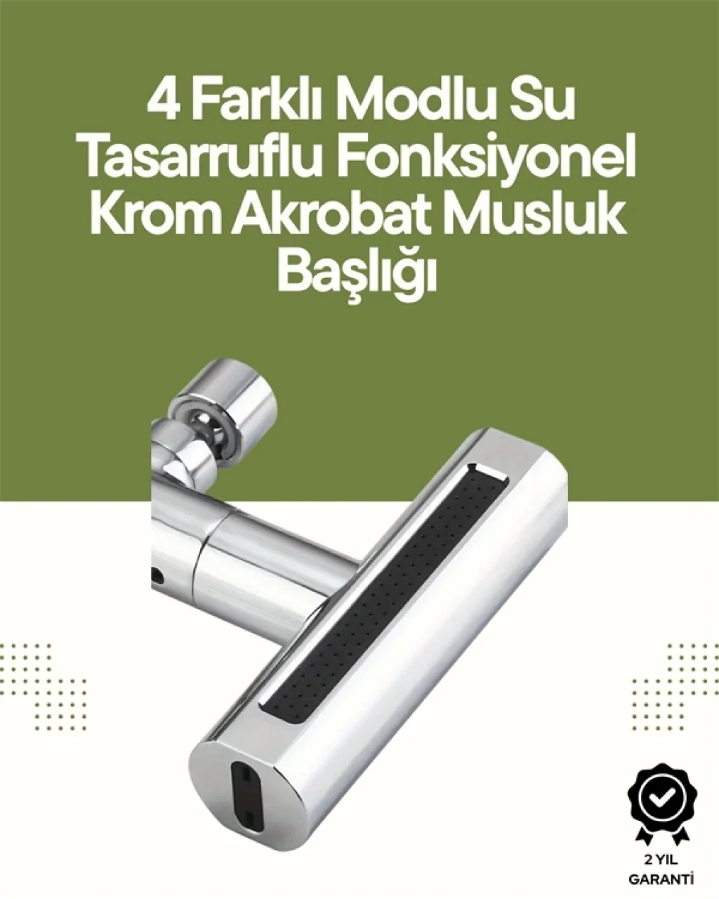 Mutfak veya banyonuzda fonksiyonellik ile modern tasarımı buluşturan CONOB 4’ü 1 Arada Musluk Başlığı ile tanışın. Bu özel tasarım musluk aparatı, günlük su kullanımınızı hem konforlu hem de verimli hale getirirken, zarif krom kaplamasıyla yaşam alanlarınıza şıklık katar. Ergonomik yapısı, yüksek kaliteli malzemesi ve çok yönlü su akış kontrolüyle evinizdeki musluğa yepyeni bir boyut kazandırır.4 Fonksiyonlu Su Çıkışı – Her İhtiyaca Uygun Akış ModuBu yenilikçi musluk aparatı, 4 farklı su akışı modu ile öne çıkar:YAĞMUR modu: 5 inç genişliğinde yumuşak ve yoğun su çıkışıyla ellerinizi veya sebzeleri hassas şekilde yıkamak için mükemmel.WATERFALL (Şelale) modu: Benzersiz geniş ve güçlü su akışıyla yüksek hacimli ve sıçramasız dolum sağlar.SPREY modu: Yüksek basınçlı sprey çıkışıyla bulaşık yıkamak veya yüzey durulamak için idealdir.KABARCIK (Bubble) modu: Sessiz ve sıçramayan su akışı sunar; özellikle bebek yıkama veya yüz temizliği gibi hassas kullanımlar için uygundur.360° Dönebilen Tasarım – Tek Kollu Kol ile Akıllı GeçişTek kollu ergonomik tutma kolu, 360 derece dönme özelliği sayesinde lavabonun her köşesine rahat erişim sağlar. İhtiyacınıza göre musluğu dikey ve yatay eksende çevirerek su çıkış modları arasında geçiş yapabilirsiniz. Kullanımı kolaydır ve pratik su kontrolü sağlar.Yüksek Kaliteli Malzeme – Uzun Ömürlü KullanımCONOB musluk aparatı, plastik muadillerinin aksine ABS + pirinç disk kartuş malzemeden üretilmiştir. Dayanıklı yapısı, uzun süreli kullanımda bile sızdırmazlık ve performans sunar. Şık cilalı yüzeyi su lekelerine ve korozyona karşı dirençlidir. Bu sayede mutfağınızda ya da banyonuzda hem estetik hem de dayanıklı bir çözüm sunar.Geniş Uyumluluk – Kolay KurulumMusluk başlığı, M22 dişi dişe sahip musluklara doğrudan bağlanabilir. Aynı zamanda, 15 mm ile 22 mm arasında değişen musluk çıkışlarına uygun adaptör seti ve sızdırmazlık rondelaları ürünle birlikte gelir. Standart olmayan musluklarla bile tam uyumludur. Montaj için ekstra teknik bilgi gerekmez, herkes rahatlıkla kurabilir.Ev, Ofis ve Kamp Kullanımı İçin İdealMutfakta meyve/sebze yıkarkenBanyoda bebek yıkarken veya yüz temizliğindeOfiste ya da kamp alanlarında şelale gibi güçlü akıştan faydalanmak içinSprey modunda bulaşık yıkamak için mükemmel seçimHarika Hediye SeçeneğiZarif tasarımı ve pratikliği ile yeni ev hediyesi, anneler günü, babalar günü, yılbaşı, doğum günü gibi özel günlerde sevdikleriniz için fonksiyonel bir hediye olabilir.Ürün ÖzellikleriMalzeme: ABS + Pirinç Disk KartuşKaplama: Cilalı kromSu çıkış modları: Yağmur, Şelale, Sprey, KabarcıkDönüş Açısı: 360°Uygun Musluk Tipi: M22 dişli musluklar ve 15-22 mm arası çaplara sahip çıkış borularıKurulum: Kolay, aletsiz montajKullanım Alanı: Mutfak, banyo, kamp alanı, ofis lavaboları