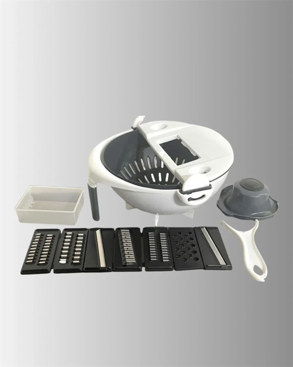 Mutfakta zaman kazanmak isteyen herkesin ihtiyaç duyacağı pratik bir yardımcı olan bu rende ve dilimleyici seti, çok yönlü kullanım imkanı sunar. Döner mekanizması sayesinde farklı bıçak türleri arasında kolayca geçiş yapılabilir. Sebzeleri ister ince ister kalın rendeleyebilir, yuvarlak ya da şerit şeklinde dilimleyebilirsiniz. Hazneli yapısı sayesinde doğradığınız malzemeler doğrudan içinde toplanır. Alt kısmında bulunan süzgeç özelliği, yıkanan sebzelerin suyunu kolayca boşaltmanıza imkan verir. Kaymaz tabanı ve el koruma aparatı sayesinde hem güvenli hem de konforlu bir kullanım sunar.