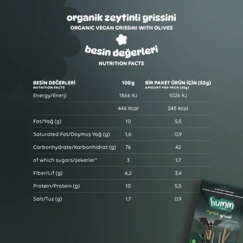 Humm Organik Zeytinli Grissini, doğal ve sağlıklı atıştırmalık arayışında olanlar için mükemmel bir seçimdir. 55 gramlık pratik paketiyle her an yanınızda taşıyabileceğiniz bu çıtır lezzetler: