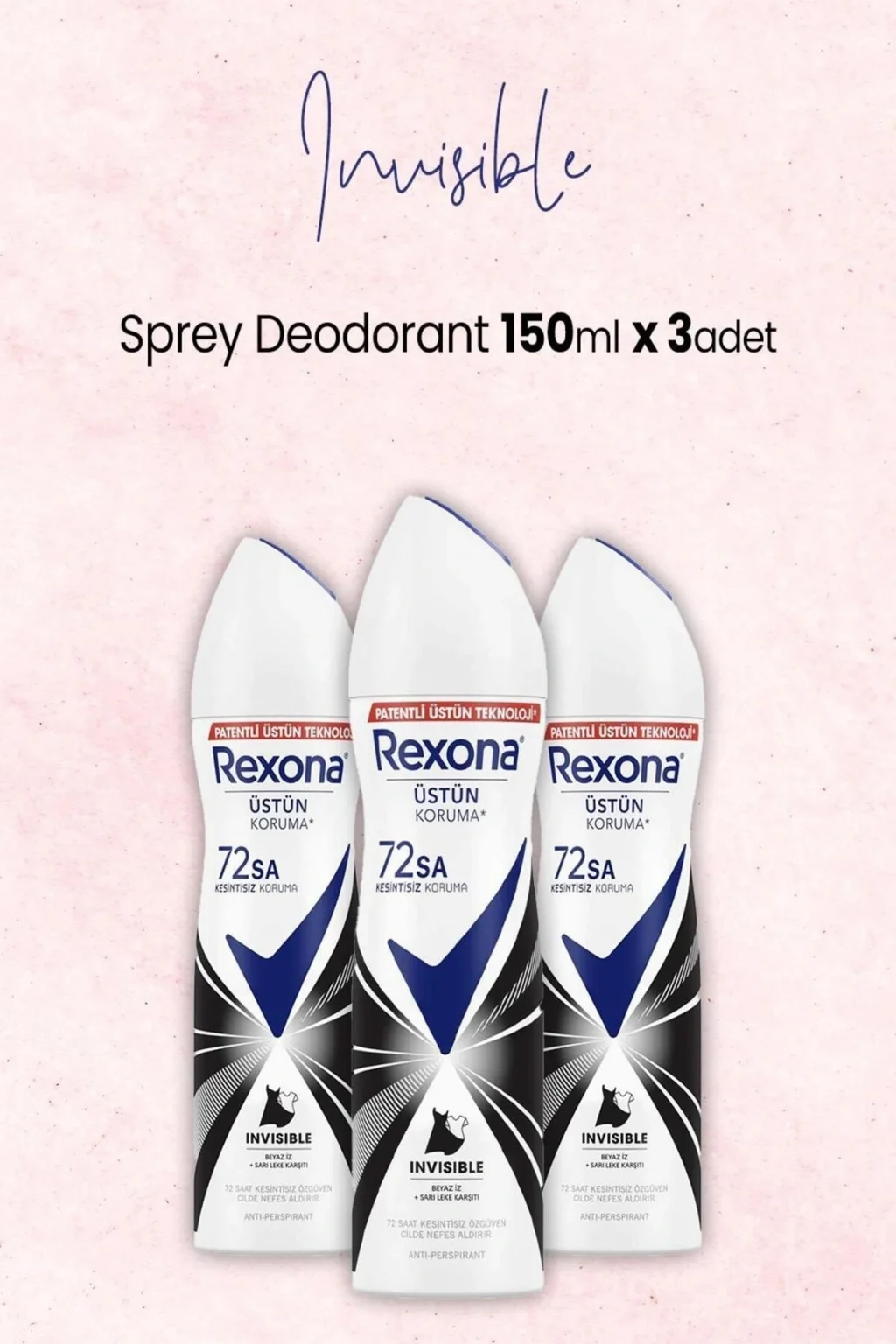 Rexona kadın sprey deodorant ınvisible 150 ml x 3 adet, kıyafetlerde iz bırakmayan formüle sahip rexona ınvisible black white kadın deodorant temiz ve çiçeksi kokusu ile gün boyu ferah hissetmeni sağlar. ; Zorlu iş hayatında ve hareketli günlerde terlemek kaçınılmaz değil! Rexona ınvisible black + white, tere ve ıslaklığa karşı 72 saat koruma sunar. ; Devrim niteliğindeki yeni teknolojisiyle 10 yıl süren çalışmaların sonunda üretilen yeni ınvisible black white kadın deodorant daha önceki aerosol ürünlerden çok daha etkili koruma sağlar. ; Yaydığı temiz ve çiçeksi koku ile gün boyu ferah ve temiz hissetmizi sağlar. ; Kıyafetlerde hiçbir iz bırakmayan formülü sayesinde her zaman her yerde kullanabilirsin. ; Ter kokusuna ve ıslaklığa karşı 72 saat boyunca kesintisiz korumapatentli mikroteknolojisıradan aerosol teknolojisine göre daha üstün korumatemiz ve çiçeksi kokusiyah kıyafetlerde beyaz iz, beyaz kıyafetlerde sarı leke bırakmaz butane, ısobutane, propane, ppg-14 butyl ether, cyclopentasiloxane, aluminum sesquichlorohydrate, parfum, c12-15 alkyl benzoate, disteardimonium hectorite, glycine, aqua, calcium chloride, octyldodecanol, bht, helianthus annuus (sunflower) seed oil, propylene carbonate, dimethiconol, maltodextrin, sodium starch octenylsuccinate, hydrolyzed corn starch octenylsuccinate, silica, citric acid, alpha-Isomethyl ıonone, benzyl alcohol, benzyl salicylate, citronellol, geraniol, hexyl cinnamal, hydroxycitronellal, limonene, linalool.;