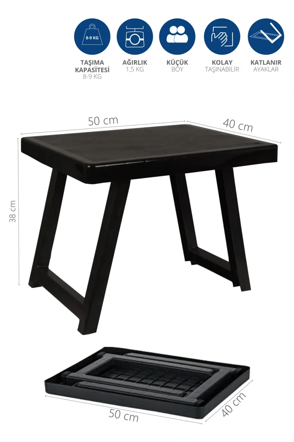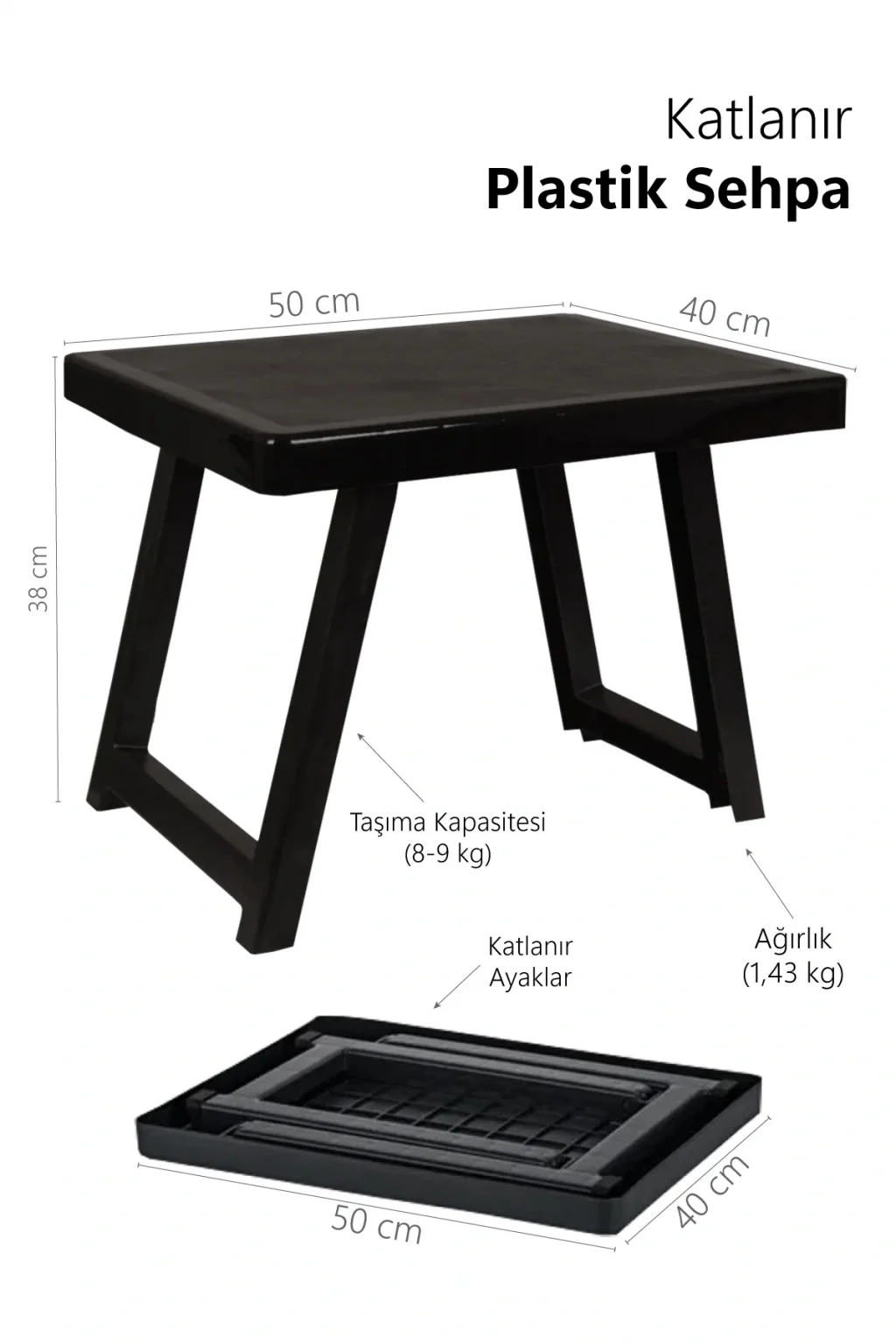 Hafif ve dayanıklı plastik malzeme kullanılarak üretilmiş, kolay taşınabilir ve uzun ömürlü kullanım sunar; Katlanabilir tasarımı sayesinde, kullanılmadığı zamanlarda yer kaplamaz ve kolayca saklanabilir; böylece kamp alanınızda ekstra yer kazandırır; Antrasit rengiyle modern ve şık bir görünüm sağlar, doğa ile uyumlu bir estetik sunar; Kolay temizlenebilir yüzeyi sayesinde hijyenik bir kullanım imkanı tanır; kamp yaparken pratiklik sağlar;