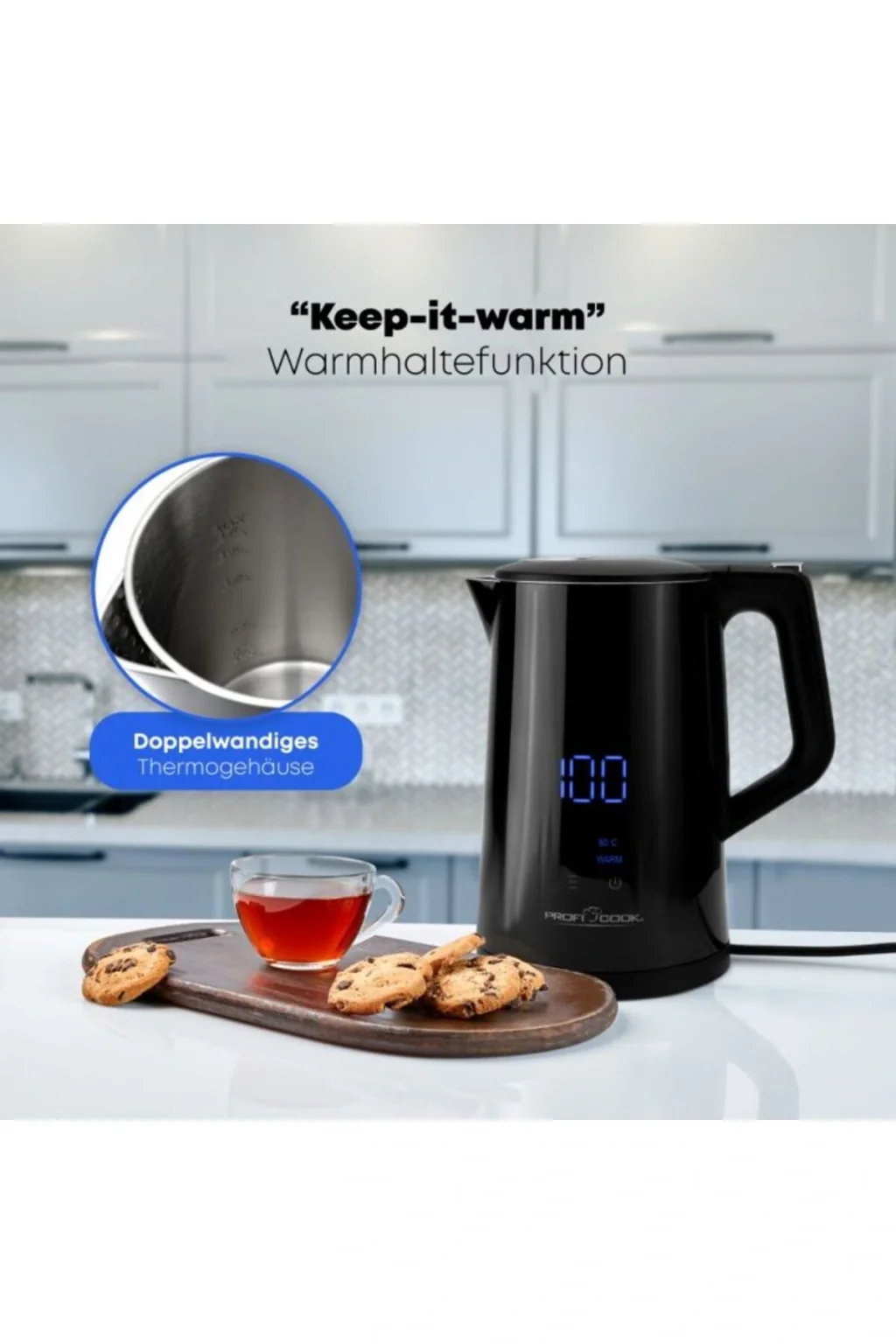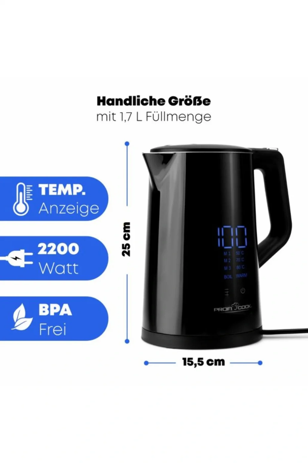 Sıcaklık ayarlı kettle'ımız ile çayınızı tam damak tadınıza göre hazırlayabilirsiniz. 50°C ile 100°C arasındaki elektronik sıcaklık ayarı sayesinde 50°C, 70°C, 80°C ve 100°C sıcaklık seviyeleri kolayca seçilebilir; Çift duvarlı termal muhafaza ve yüksek kaliteli paslanmaz çelik hazne %100 BPA içermez ve 1,7 litreye kadar dolum kapasitesine olanak tanır; Geniş LED ekran sayesinde sıcaklığı gerçek zamanlı olarak takip edebilirsiniz. "Sıcak Tutma" fonksiyonu çayınızı sıcak tutar; Kablosuz teknoloji sayesinde kolay kullanım, sensörlü dokunmatik kullanım ve 360° dönebilen fiş bağlantısının yanı sıra tek elle çalıştırılan güvenli menteşeli kapak, çalışmayı çocuk oyuncağı ve güvenli hale getirir; Sıcaklık göstergeli su ısıtıcı, otomatik ve manuel kapatma, dahili su seviyesi göstergesi ve kuru çalışma/aşırı ısınma koruması sunar;