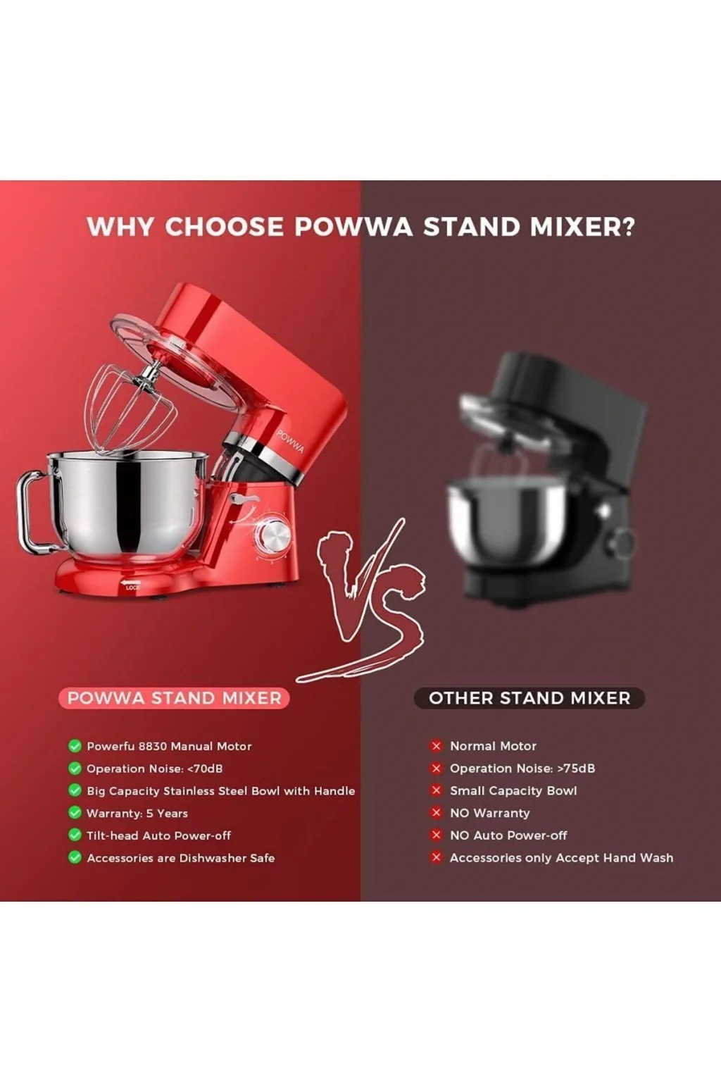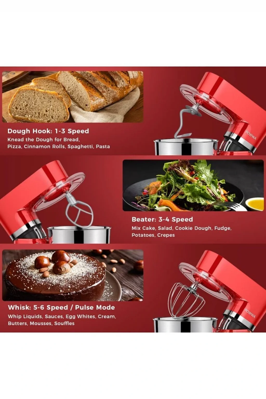 - Güçlü performans: 1500 watt motor gücü ile zorlu karıştırma işlemlerini kolayca halledin.; - Dayanıklı malzeme: Paslanmaz çelik gövdesi sayesinde uzun ömürlü kullanım ve kolay temizlik imkanı sunar.; - Geniş hacim kapasitesi: 6.2 QT (5.9 LT) büyük haznesi ile büyük miktarlardaki malzemeleri rahatça karıştırabilirsiniz.; - Çok yönlülük: 6 kademeli hız ayarı ile farklı tarifler için ideal karıştırma hızını seçebilirsiniz.; - Güvenilir garanti: 2 yıl ithalatçı garantisi ile satın alma sonrası da güvende hissedin.; - Pratik aksesuarlar: Hamur yoğurma işlemleri için ekstra hamur kancası bulunur, böylece mükemmel kıvamlı hamurlar elde edersiniz.; - Uygun voltaj ve frekans: 220 - 240 V ve 50 Hz / 60 Hz standartlarına uygun olarak tasarlanmıştır, evinizin elektrik sistemine kolayca uyum sağlar.; - Kolay kullanım: C / F priz tipi sayesinde geniş bir priz yelpazesiyle uyumluluk gösterir.; - Şık tasarım: Klasik tema ve kırmızı renk seçeneğiyle mutfağınıza modern bir dokunuş katın.
