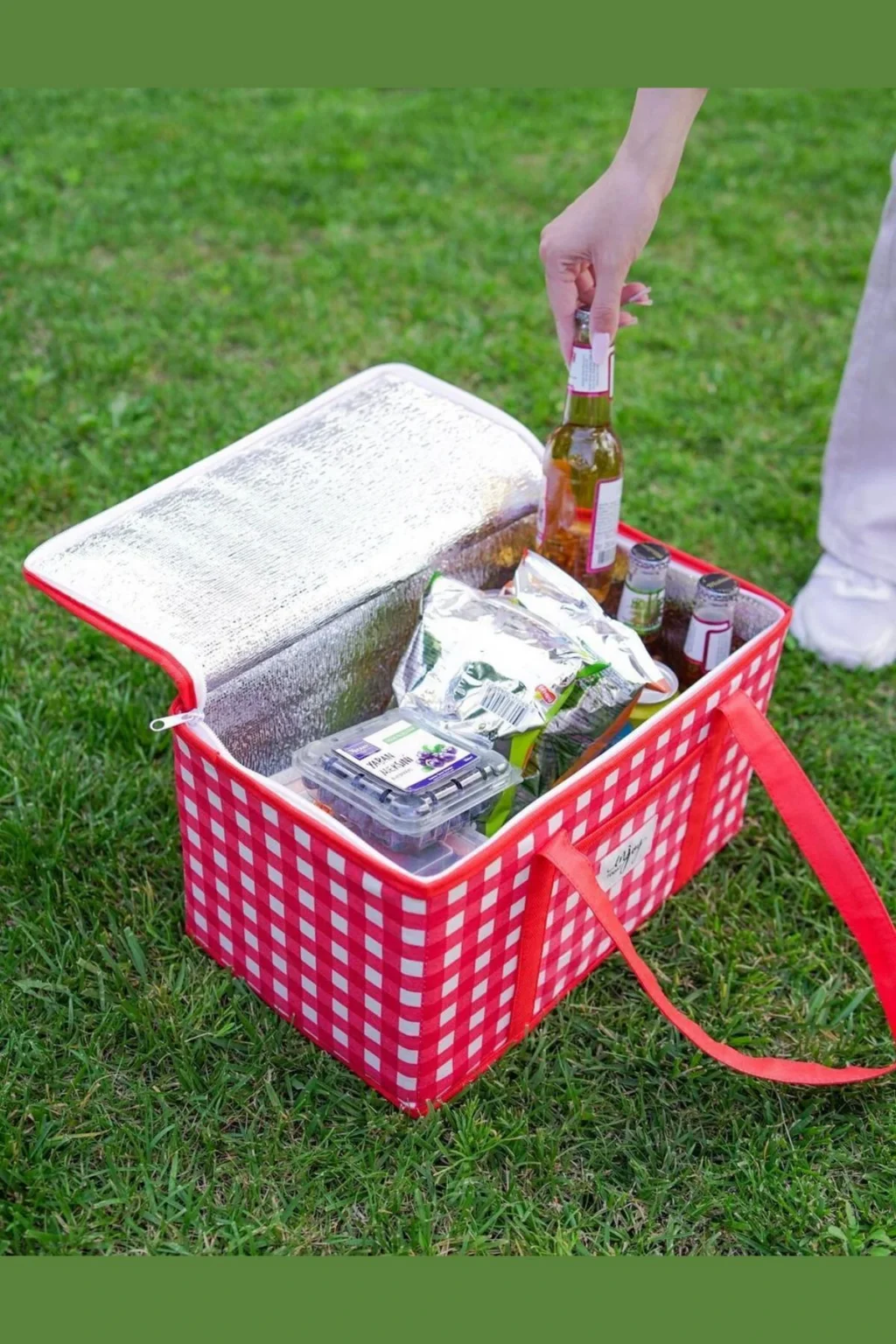 Yalıtımlı Termal Piknik Çantası Kırmızı Pötikare Kulplu Soğuk Taşıma Çantası 35x20x20cm
