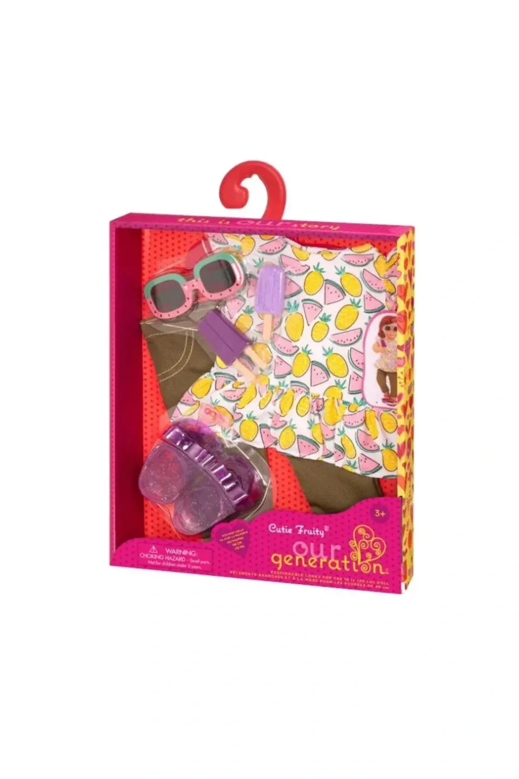 Our Generation Kıyafet - Cutie Fruity Yaş Grubu: 3 yaş üzeri için uygundur. Ürün özellikler: Ürün Kutu Ölçüleri: 26x21x4 cm ; Our Generation 46 cm bebekler için kıyafet seti. ; Resimde görülen aksesuarlar dahildir. Bebekler dahil değildir. ; Renkli ve son moda kıyafetlerini diğer kıyafetleri ile kombinleyebilirsiniz.; Paket içeriği: 1 adet bluz; 1 adet pantolon; 2 adet dondurma; 1 çift ayakkabı ; 1 adet gözlük ; Our Generation oyuncak bebek ve aksesuarlarını nasıl temizlemeli ve korumalıyım? Oyuncak bebeklerin yüzleri ve bedenlerini ıslak ve sabunlu bir bez ile nazikçe yıkayın ve sonra oda sıcaklığında doğal kurumaya bırakın. Giysi ve aksesuarları soğuk su ve hafif bir sabun ile temizleyin ve daha sonra sererek kurutun. Çamaşır makinesinde yıkamayınız, kurutucuda veya doğrudan ısı kaynağının yakınında tutmayınız.