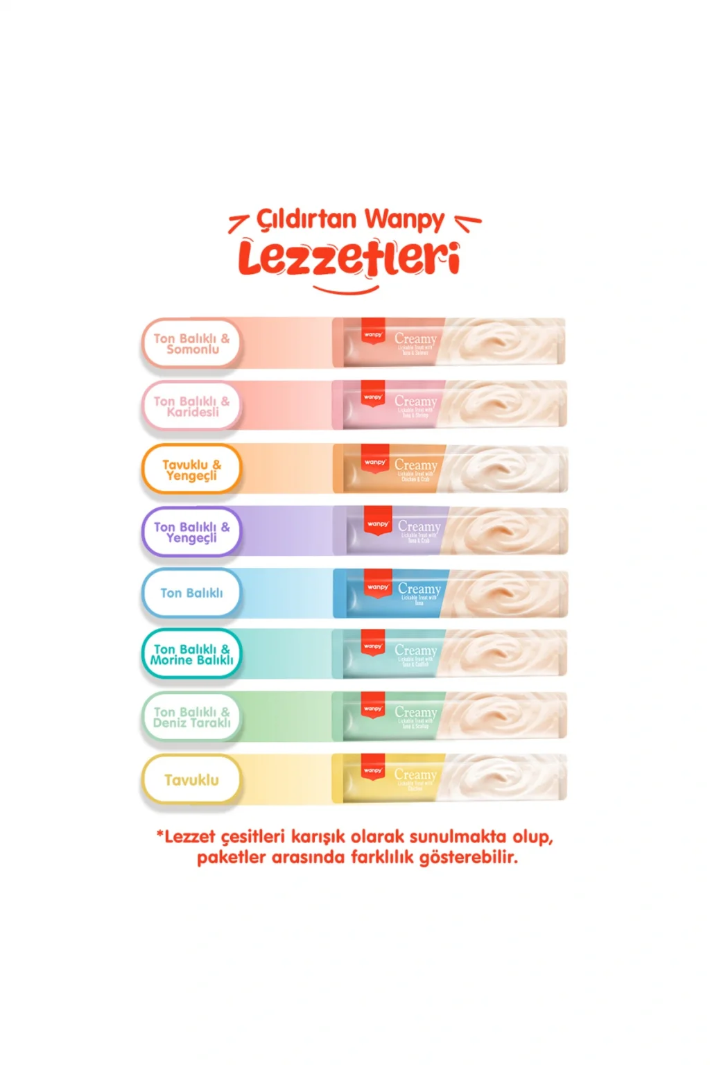 Kedinizin mutluluğunu ve sağlığını aynı anda besleyin! Wanpy Krema Kedi Ödül Maması, kedinizin davranışlarını ödüllendirmeniz için geliştirilen yüksek proteinli, az yağlı ve %100 doğal içerikli sıvı kedi ödülüdür.;Ürün Özellikleri :;* Ürünler karışık lezzetlerde gönderilmektedir.;* 10 adet 14 gramlık karışık krema poşetinden oluşur.;* Ürünler poşetlenmiş şekilde tarafınıza gönderilmektedir.;* Ambalajlı kapalı ürün değildir.;Sağlık ve Lezzet Bir Arada: Wanpy, “Güvenli, Lezzetli ve Sağlıklı” misyonu ile kediniz için en kaliteli içerikleri bir araya getirir. İçeriğinde yer alan A, B2, B3, B5, D3 ve E vitaminleri, dostunuzun genel sağlığını destekler.;Sindirim Dostu Formül: Kolayca sindirilebilir yapısı sayesinde kedinizin enerji ihtiyacını karşılar, sindirim sistemini destekler. Yumuşak dokusu, diş sağlığına katkıda bulunarak plak oluşumunu azaltır.;Analiz Değerleri:;* Nem: %90;* Protein: %6.5;* Yağ: %0.1;* Lif: %1