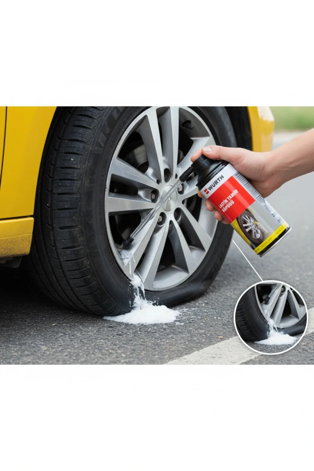 Würth Lastik Tamir Edici-Şişirici Sprey, Lastik Tamirine Son!!! 300 Ml.; Made in Germany 04893490.Sizi zor durumlardan kurtarır.; Patlak ve hava basıncı inmiş lastiklerinizi pratik şekilde onarıp,şişirerek yola devam etmenizi sağlar.; Tüm ürünleri ozon ile dost olup, çevre ve insan sağlığına saygılıdır.; Made in Germany.; Uygulama: · Aracınızın lastiği indiğinde aracınızı durdurup, inen lastik üzerinde batmış olan çivi yada benzeri cisim var ise mümkün ise çekip çıkarınız.; · Lastiğin hava girişi olan sibobun yukarıda kalmasını sağlayacak şekilde park ediniz.; · Tenekeyi iyice salladıktan sonra hortum ucundaki aparatı siboba vidalayarak lastik içine yeterince sıkınız.; · Lastiğinizde Büyük bir yarık yok ve tamamen yere oturmuş değil ise bir tenekeden azı lastiğinizin tamiri için yeterli olacaktır.; · Lastiğin hava basıncı yeterli değil ise kompresör yada ayak pompası ile hava basabilirsiniz.; · Yada en yakın benzin istasyonunda pompa ile hava basıncının yeterli olduğuna emin olunuz.