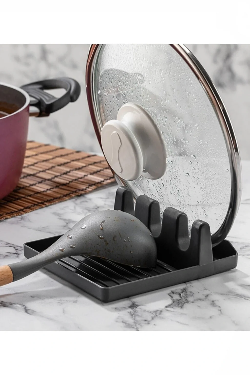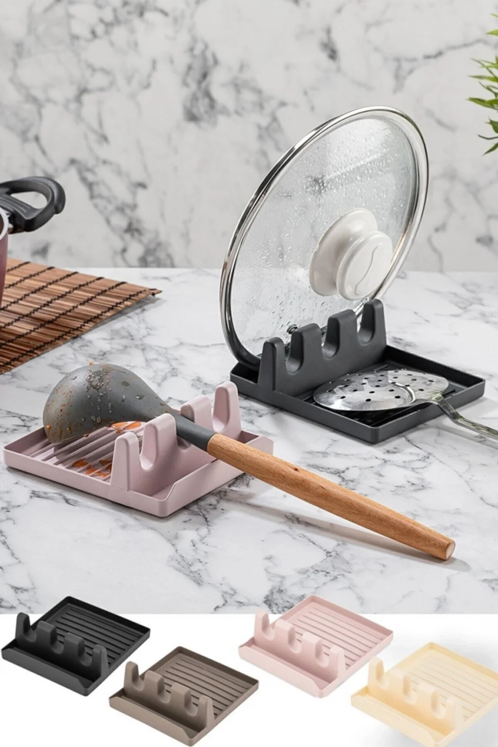 BKepçe altlığı, kaşık altlığı olarak kullanabildiğiniz gibi aynı zamanda tencere kapağınızı da tutacak bir yapıya sahiptir.; ; Herhangi bir boyutta Kaşık, Kepçe ve Spatula yerleştirilebilir.; ; Kolay temizlenebilir, bulaşık makinesinde yıkanabilir.; ; Ürün Boyutları: 12,5 cm x 15 cm x 5 cm’dir.; ; Ürün Rengi: beyaz, gri antrasit rekleri mevcuttur, stok durumuna göre gönderilecektir.; ; Paket İçeriği: 1 Adet Pratik Kaşık Kepçe Altlığı ( Kaşıklık Tencere Kapağı Spatula Tutucu Mutfak Düzenleyici Organizer )