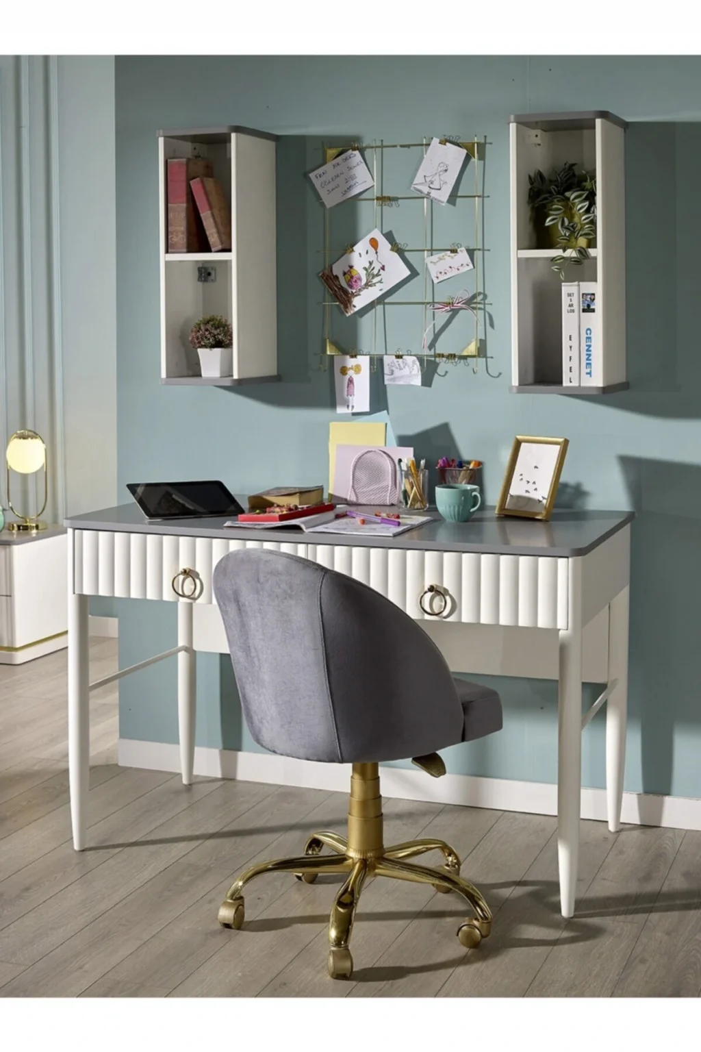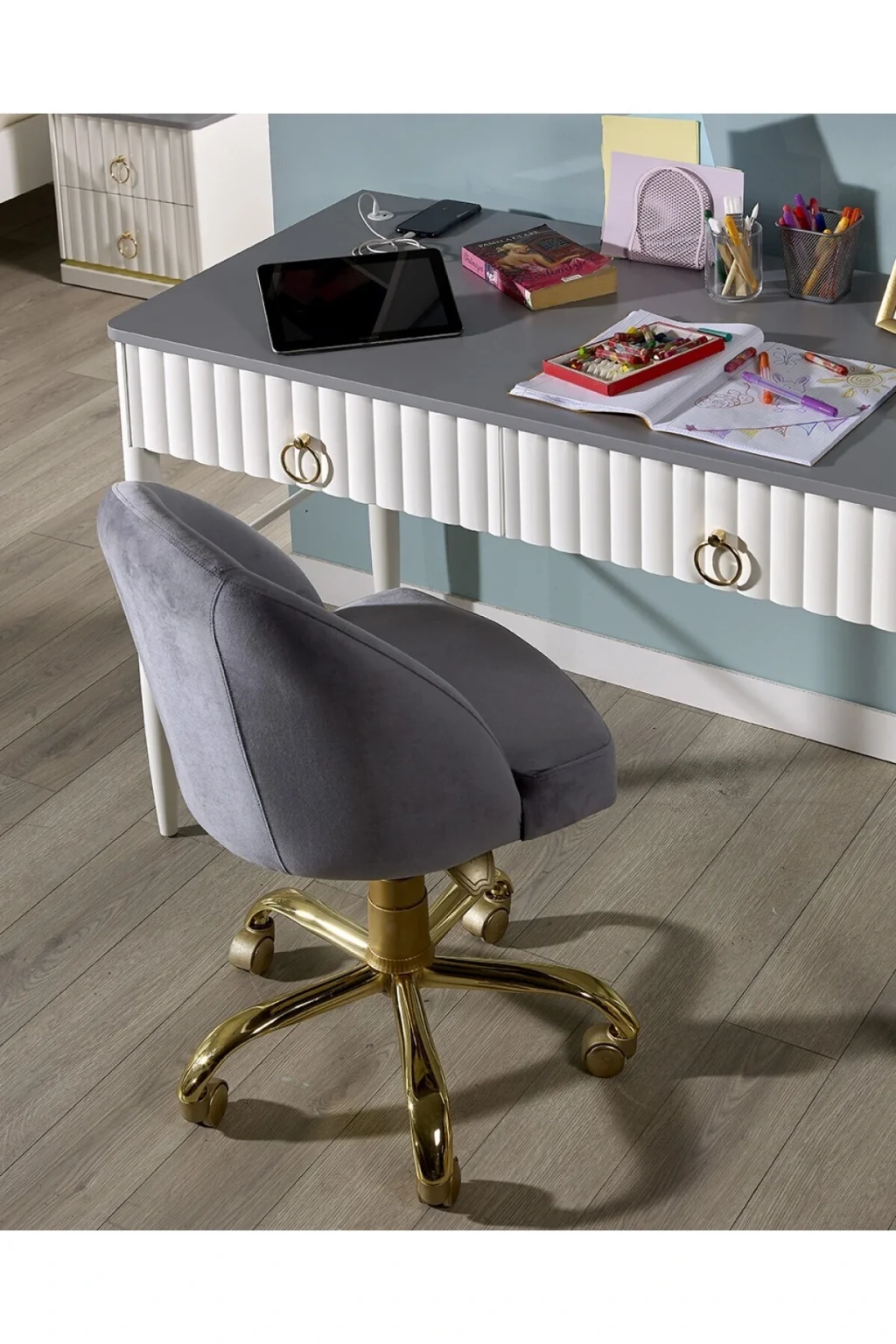 Meltem Linda Genç Odası Amortisörlü Tekerlekli Çalışma Sandalyesi; Amortisörlü yapısı ile yükseklik ayarı yapılabilir; Metal eskitme bronz görünümlü tekerlekli ayak. Demir profil iç iskelet; Amortisör en alt kademede oturum yüksekliği: 43 cm; Amortisör en üst kademede oturum yüksekliği: 54 cm; Oturum yeri derinliği: 42 cm; Oturum yeri genişliği: 50 cm; Kolçak arası oturum yeri: 37 cm; Sırt yüksekliği: 34 cm; Ürün tek paket olarak sevk edilmektedir. Paket ölçüleri (12 kg): 51 cm x 62 cm x 63 cm; Ürün demonte olarak olarak sevk edilmektedir. Ürünün tekerler ve amortisör aksamı monte edilmesi gerekmektedir; Çekimlerden kaynaklı görsellerde ton farklılıkları olabilir;