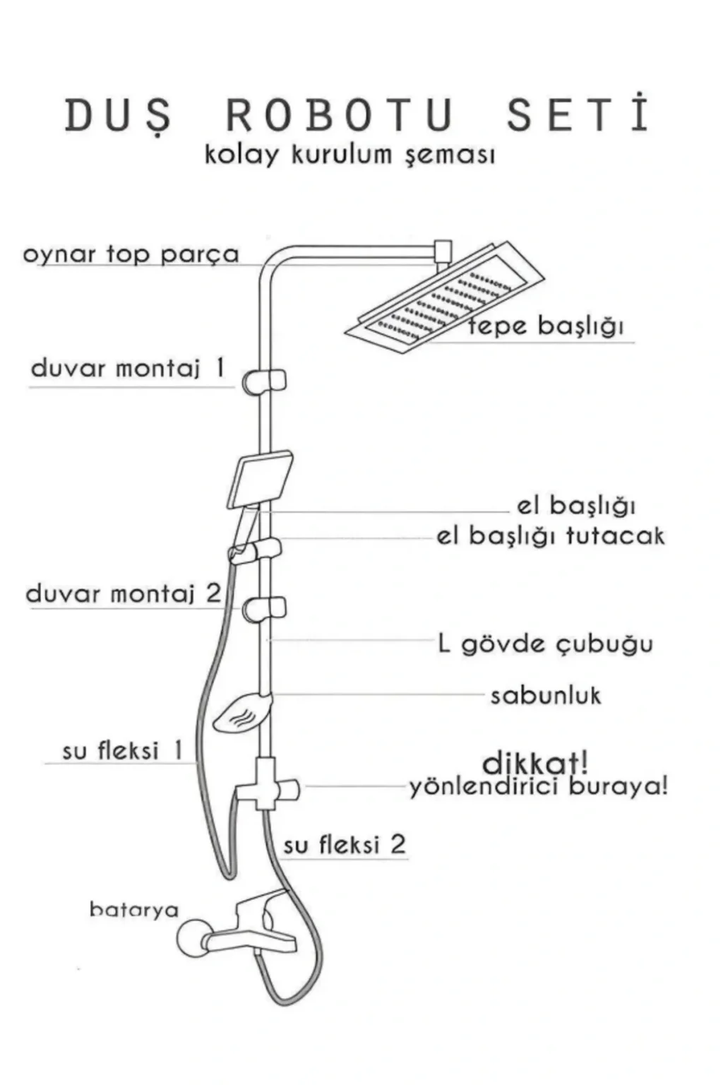 - Modern tasarımıyla banyonuza şıklık katan yeni nesil robot yağmurlama tepe duş başlığı seti.; - Dayanıklı krom kaplama malzemesi sayesinde uzun ömürlü kullanım sunar.; - Çin menşeli olup, kalite standartlarına uygun olarak üretilmiştir.; -K Web sitesindeki gri renk seçeneğiyle banyonuzda modern bir görünüm sağlar.; - Gri rengi ile hem klasik hem de çağdaş dekorasyon tarzlarına kolayca uyum sağlar.; KROM KAPLAMA; KROMLU BORU; PİRİNÇ KARTUŞ; KROMLU SABUNLUK; KROMLU TUTACAKLAR; Bağlantı Parçaları; 2 ADET HORTUM; 1 ADET SABUNLUK; 1 ADET ÜST KAFA; 1 ADET EL DUŞU; 2 ADET TUTACAK; 1 ADET EL DUŞU TUTACAĞI; 1 ADET PİRİNÇ YÖNLENDİRİCİ; KALİTELİ AMBALAJ; - Modern ve şık tasarımıyla banyonuza yeni bir soluk getiren robot yağmurlama duş başlığı seti.; - Krom kaplama materyali sayesinde uzun ömürlü kullanım ve dayanıklılık sunar.; - Gri renk seçeneği ile banyonuzun dekorasyonuna kolayca uyum sağlar.; - Yeni nesil robot teknolojisi ile su akışını otomatik olarak ayarlar ve konforlu bir duş deneyimi sağlar.; - CN menşeili olup, kalite kontrolünden geçmiş yüksek standartlarda üretilmiştir.