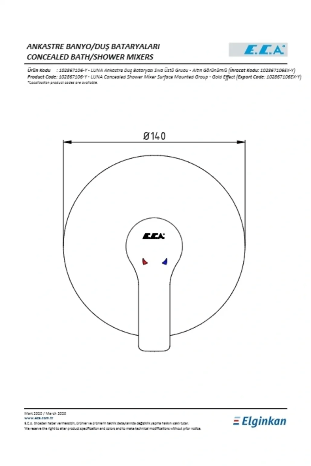 ECA Luna Ankastre Duş Bataryası Sıva Üstü Ürün Kodu: 102867106-Y Garanti Süresi: 2 Yıl Garantilidir. ; Yetkili Servis No: 444 0 322 Teknik Özellikler Köşeli, Yuvarlak ve Elips Olmak Üzere 3 Tip Rozet Alternatifi Mevcuttur Ürün Sadece Sıva Üstüdür, Sıva Altı Grubu Olmadan Tek Başına Kullanılamaz. ; Sıva Altı İçin 102866102 Kodlu Sıvaltı Grubu Alınmalıdır Kaplama Altın Renkli Temizlik Temizleme işlemi yüzeyi yabancı maddelerden arındırma işlemidir. ; Düzenli temizleme ve bakım ile kromlu yüzeyler görünümler uzun süre koruyabilir. ; Yüzeydeki toz kurumuş lekeler ile benzeri kirlilik yaratan artıklar ıslak bir bez ile temizlenmelidir. ; Temizleme suyu kireçli ise krom yüzeyde leke bırakabilir. ; Bunun için temizleme esnasında sert tanecikli ve lifli yapıda olmayan bir bez kullanılmalıdır. ; Kromlu malzemenin yüzeyinde kalan parmak izleri için cam yüzeyleri temizlemek için kullanan sıvı temizleyicilerden faydalanılabilir. ; Temizleme işleminden sonra yüzey tamamen kurulanmalıdır.Temizleme için özellikle tuz ruhu ve çamaşır suyu gibi klor içeren kimyasalların kullanılmasından kesinlikle kaçınılmalıdır.;
