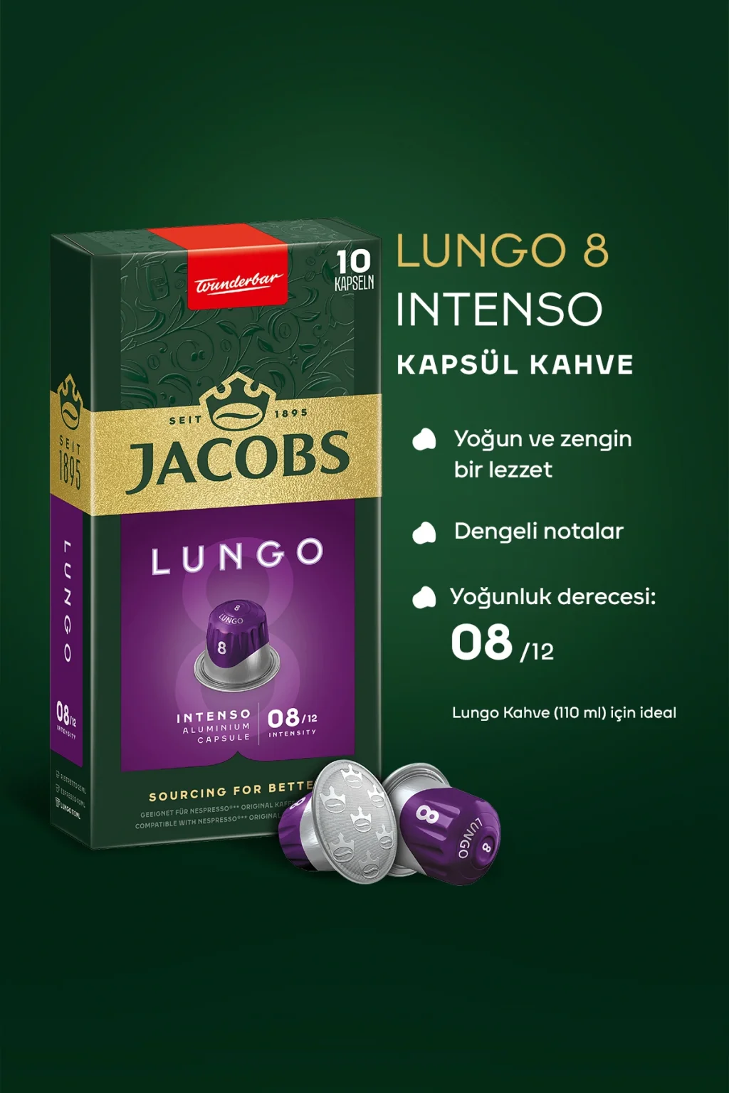 Lungo Intenso 8 Kapsul Kahve 30 Kapsül Jacobs alüminyum kapsüllerimiz Nespresso®* Original kahve makineleri ile uyumludur.; İstisnai olarak, 25 Temmuz 2016 sonrasında satın alınan U®, Umilk® , Expert® *, Vertuo®, Expert&Milk®, Prodigio® ve Prodigio&Milk® modellerinde kullanılamamaktadır.