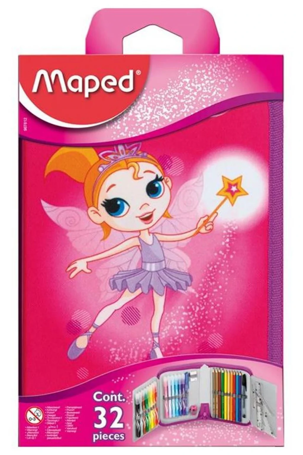 Maped Peri Kızı Okul Kırtasiye Seti İçeriği 967812 Toplam 31 parçadan oluşan Maped Kırtasiye Seti içerisinde bulunan ürünler Keçeli boya kalemi, kuru boya kalemi Kurşun Kalem, tükenmez kalem Silgi , kalemtraş Cetvel, gönye