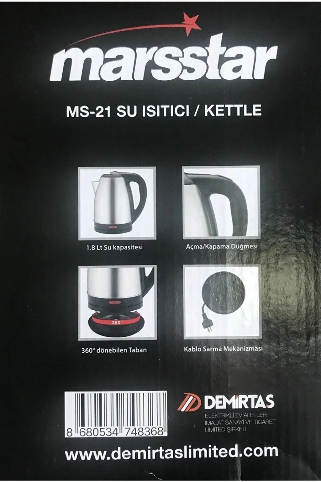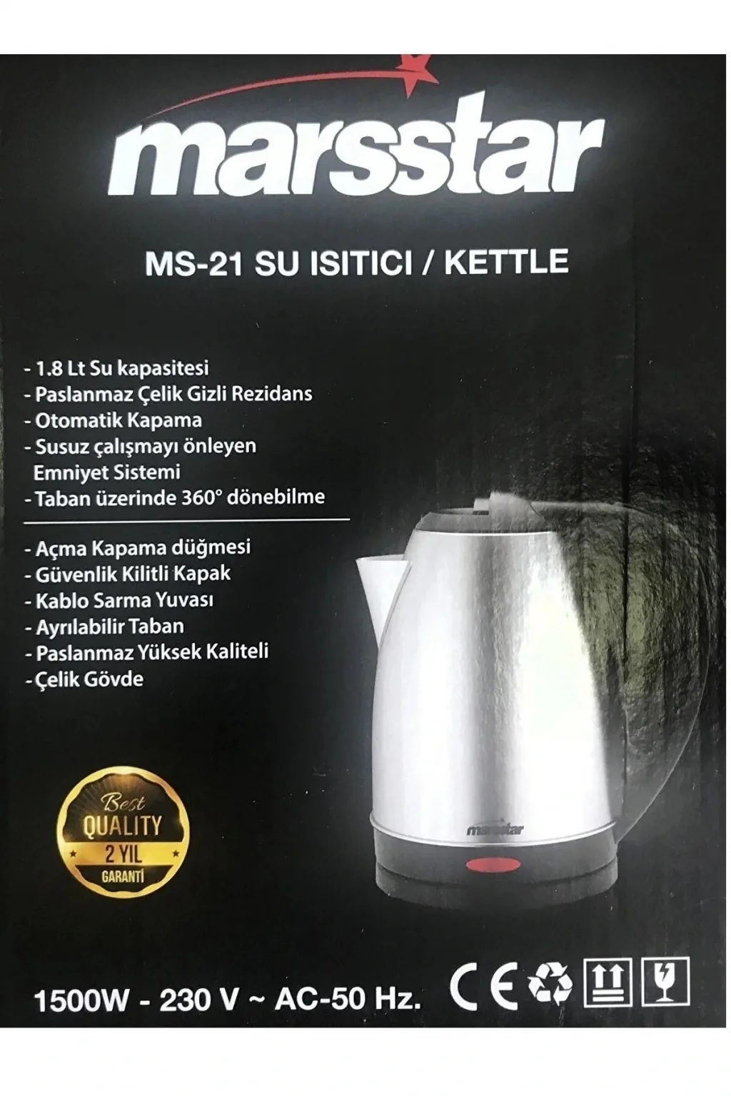 Klasik tasarımıyla mutfaklarınıza şıklık katan Marsstar su ısıtıcı, zamansız bir görünüm sunar; 2 yıl ithalatçı garantisi ile güvenilir kullanım ve uzun ömürlü bir deneyim sağlar; Gizli rezistans özelliği sayesinde suyunuz daha hızlı ısınır ve temizliği kolaylaşır; Dayanıklı metal materyali ile uzun süreli ve güvenilir bir kullanım vaat eder; Enerji verimliliği sağlayan 2000 watt ve altı güç tüketimiyle elektrik faturalarınızda tasarruf etmenize yardımcı olur; Otomatik kapanma fonksiyonu ile suyunuz kaynadığında cihaz kendini güvenle kapatır, böylece enerji tasarrufu sağlar ve olası kazaların önüne geçer;