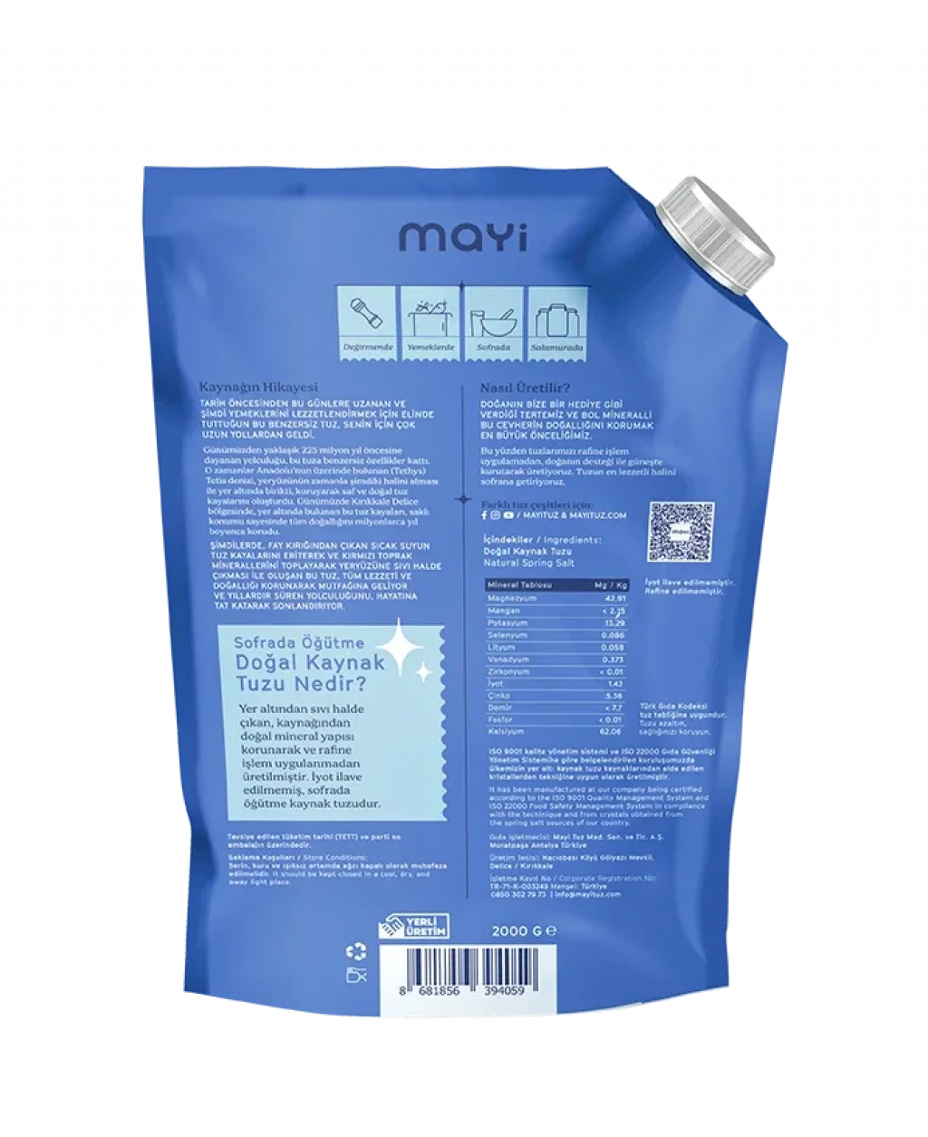 - %100 Doğal ve Katkısız: Kırıkkale'nin temiz kaynak sularından elde edilen bu tuz, hiçbir kimyasal işleme (rafinasyon, beyazlatma) maruz kalmaz. Topaklanma önleyici gibi hiçbir katkı maddesi içermez. Fermentasyon sürecini bozacak hiçbir kimyasal barındırmaz.