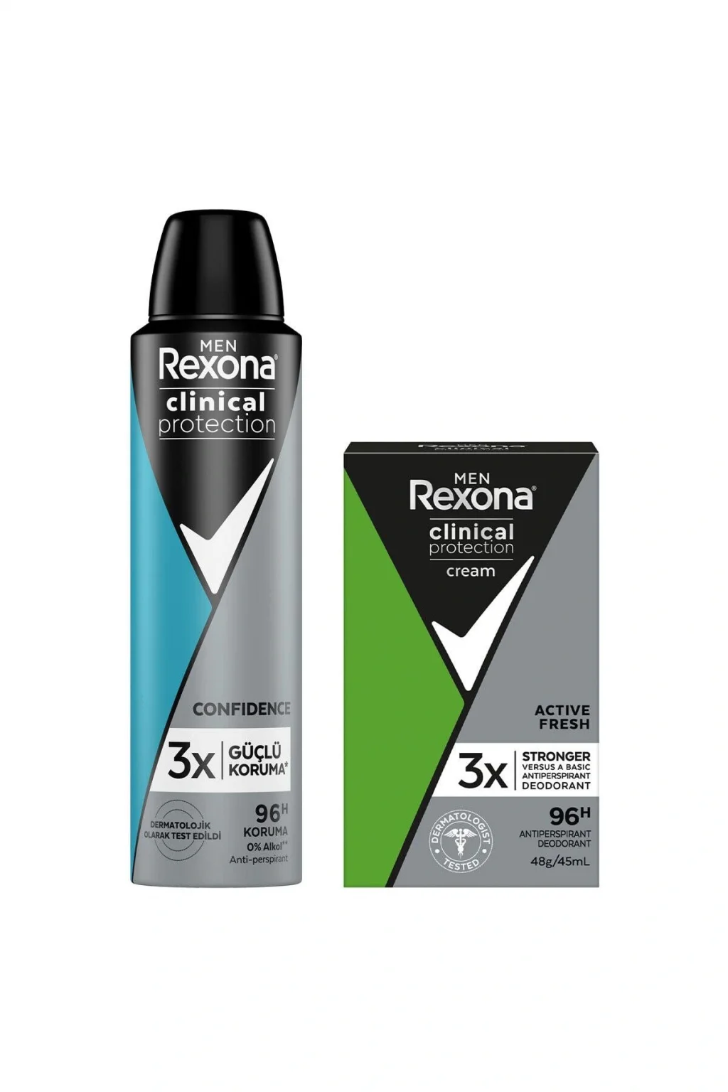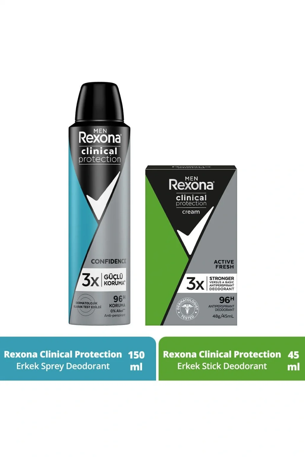 Rexona Men Clinical Protection Erkek Sprey Deodorant 150 ml Ter Kokusu Ve Islaklığa Karşı 3 Kat Daha Güçlü Koruma Klinik Koruma… Ter kokusu ve ıslaklığa karşı 3 kat daha güçlü koruma Klinik Koruma… Rexona’dan bir yenilik daha.; Rexona Men Clinical Protection Sprey Deodorant.; Herkes terler.; Bazılarımız diğerlerinden daha fazla ve sebepsiz yere terler.; Bu çok doğal çünkü hepimiz farklıyız.; Sıcaklığınız veya stres seviyeniz ne olursa olsun, bazen normal bir deodorant terlemeyi önlemez ve aşırı terleme günlük hayatınızda ciddi bir sorun haline gelebilir, ancak Rexona Men Clinical Protection sizi asla yarı yolda bırakmaz.; Rexona, terleme sorunu ile mücadele etmek ve kuru kalmanıza yardımcı olmak için çığır açan Gelişmiş Aktif Teknolojisini geliştirdi.; Gelişmiş Aktif Teknolojisi 96 saat koruma sağlayan mikro kalkanlar oluşturur ve 3 kat daha güçlü ter koruması sağlar.; Günlük hayatından ve özellikle önemli anlarda ıslaklık ve ter kokusundan etkilenmek istemeyen herkes Rexona Men Clinical Protection Sprey Deododorant’ı kullanabilir.; Rexona Men Clinical Protection, terleme problemine karşı ileri düzey ve uzun süren bir koruma sağlar ve günlük kullanıma uygundur.; Özel formülü kuru ve ferah kalmanızı sağlar, özgüvenle hareket etmenize yardımcı olur.; Bu mükemmel ter önleyici deodorantın Gelişmiş Aktif Teknolojisi 96 saat koruma sağlayan mikro kalkanlar oluşturur.; Rexona Antiperspirant ürünlere kıyasla 96 saat sonrasında X3 daha güçlü ter koruması sağlar, Motion Sense™ teknolojisi sayesinde ise ekstra ferahlık sağlar.; Tek uygulama gün boyu sizi kuru ve ferah tutar.; Dermatolojik olarak test edilmiştir.; Ya kokusu? Sedir ağacı, kırmızı meyveler ve zengin çiçek kokuları harmanlanan formülü gün boyu ferah ve durdurulamaz hissetmenizi sağlar.; Kullanım önerisi; Vücut sıcaklığı gün içinde sabit kalmaz.; Normal koşullarda vücut sıcaklığımız akşamları en düşük sıcaklığına, gün ortasında en yüksek sıcaklığa ulaşır.; Terleme miktarı da bu değişimlerden etkilenir.; Gece uykusu esnasında, ter bezleri en az aktif olduğu için Rexona Men Clinical Protection’ın özel formülü daha kolay çalışır ve ertesi gün de devam edecek güçlü bir koruma sağlar.; REXONA Clinical Protection Erkek Stick Deodorant Active Fresh Ter Kokusuna Karşı Koruma 45 ML Fazla terlemeye karşı geliştirilen krem stick deodorant Rexona Men Clinical Protection, hem ter kokusuna hem de ıslaklığa karşı güçlü koruma sağlar.; Fazla terleme kötü bir kokuya ve terlemeye bağlı olarak giysilerde ıslaklığa neden olur.; Fazla terlemeye ve kötü kokuya karşı korunmak için Clinical Protection Active Fresh Anti-Perspirant Erkek Stick kullanabilirsiniz.; Clinical Protection Active Fresh Anti-Perspirant Erkek Stick, erkeklere özel geliştirilmiş formülü sayesinde terleme kaynaklı ıslaklığa ve ter kokusuna karşı maksimum koruma sunar.; Ürünün etkisi 48 saate kadar sürer.; Rexona Men Krem Stick Deodorant, gün boyu hareket halinde olan erkekler için her an duş ferahlığı ve kuruluk vadeder.; TRIsolid™ teknolojisi kullanılan özel formül, vücut hareketlerinize uyum sağlar.; TRIsolid™ formülü, siz hareket ettikçe etkisini artırır Kaldırımda yürürken ya da kortta maç yaparken canlı narenciye kokusu her zaman size eşlik eder.; Böylece her an güven içinde hareket edebilir ve özgürce içinizdeki enerjiyi sergileyebilirsiniz.; Clinical Protection Active Fresh Anti-Perspirant Erkek Stick, en yoğun tempoda bile ferahlık vadeder.; Ürün günlük kullanıma uygundur.; Çok terleyeceğiniz zamanlarda, Clinical Protection Active Fresh Anti-Perspirant Erkek Stick sayesinde kuru kalın ve temizlik hissinin keyfini çıkarın.; Rexona sizi asla yarı yolda bırakmaz.; Gece ter bezlerinizin daha az aktif olduğu saatlerde uygulanması önerilen TRIsolid™, vücudunuzun kimyasına tepki verir ve ertesi gün duş sonrasında bile maksimum koruma sağlar.