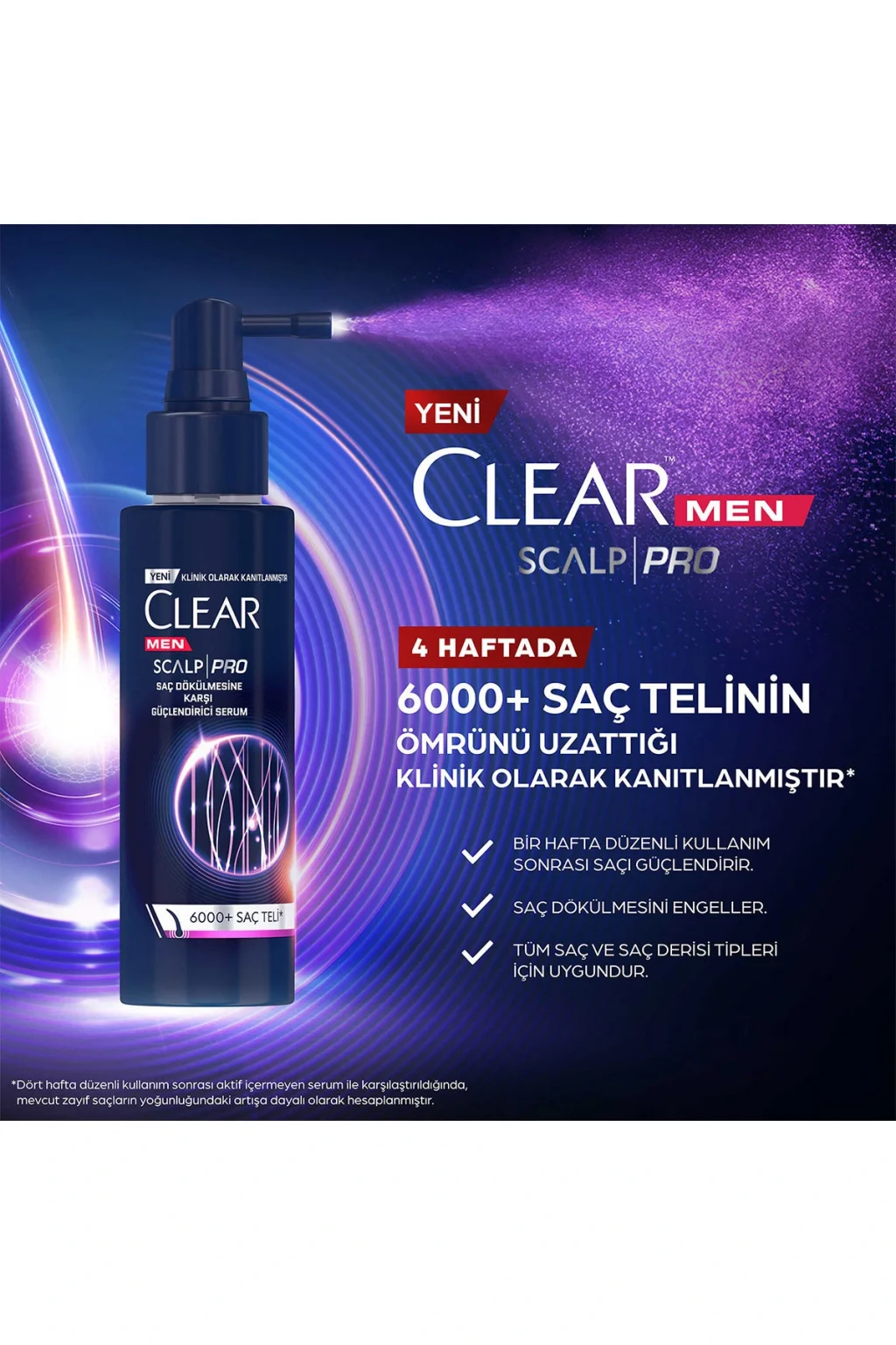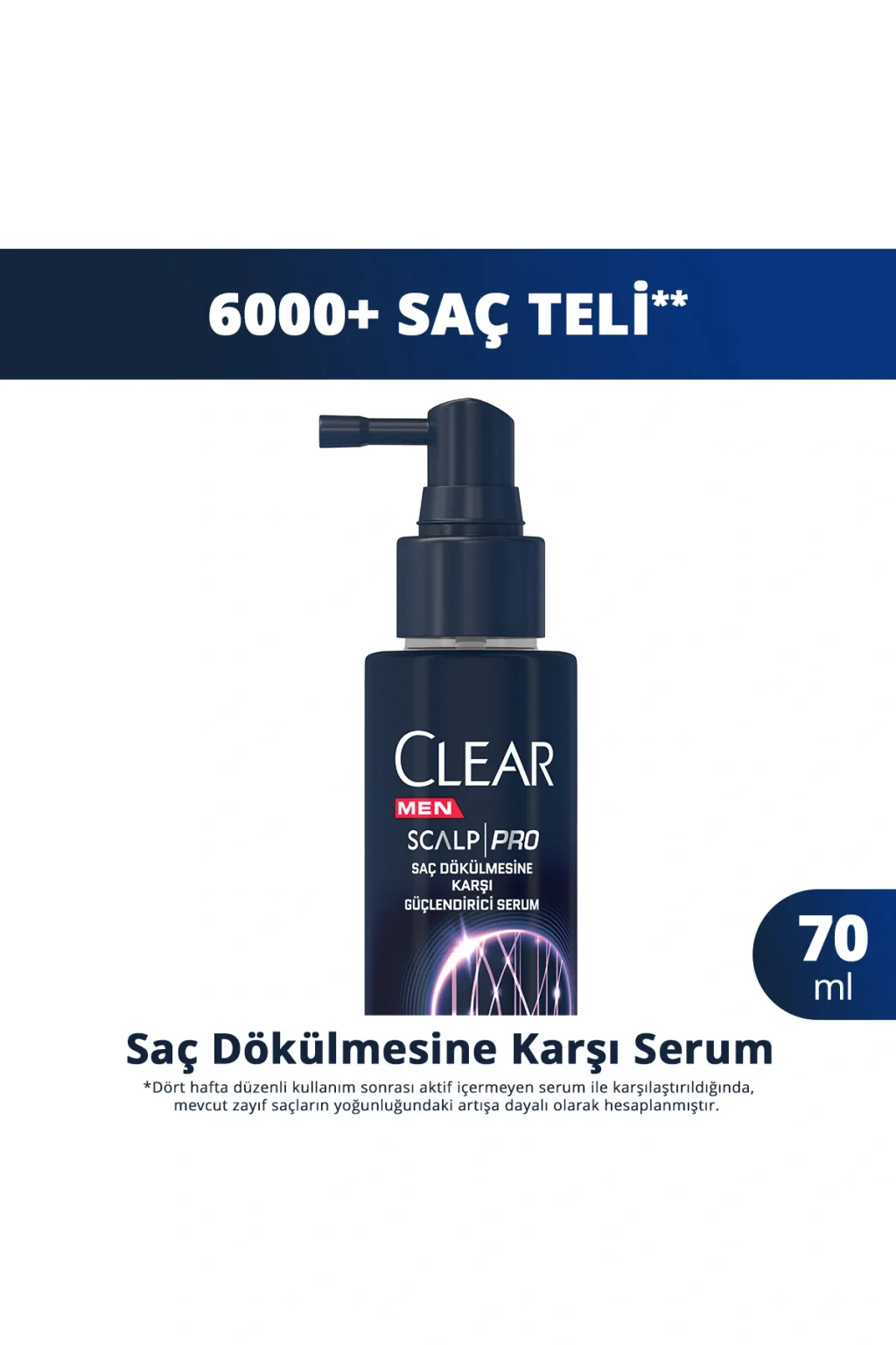 Saç dökülmesine karşı çözüm arayışında olan erkekler için Clear tarafından özel olarak üretilen bu uzman saç serumu, saç dökülmesine karşı ultra performans saç ve saç derisi çözümleri sunar.; İleri düzey saç derisi ihtiyaçları için tasarlanan Clear Men Scalp Pro Saç Dökülmesine Karşı Güçlendirici Serum, saç dökülmesine karşı ultra performans sergiler.; Saç dökülmesine karşı serumun etkin aktiflerle güçlendirilmiş formülüyle daha dolgun saçlar sağlar.; Dört hafta düzenli kullanım sonrası 6000 saç telinin ömrünü uzattığı klinik olarak kanıtlanmıştır.; * Clear’ın uzman saç bakımı sayesinde daha dolgun ve dökülmesi azalan saçlarınızla özgüveniniz her zaman tam! Clear Men Scalp Pro Saç Dökülmesine Karşı Güçlendirici Serum, gelişmiş Dynoxidil TM kompleksi içerir.; Saçın canlılığını eski haline getirmek için saç köklerine derinlemesine nüfuz eder.; Güçlendirici serumun klinik olarak kanıtlanmış formülü sayesinde bir hafta düzenli kullanım sonrası saçı güçlendirir ve ömrünü uzatır.; engeller.; Daha etkili bir sonuç için saç dökülmesi karşıtı serumu Clear Men Scalp Pro Saç Dökülmesine Karşı Güçlendirici Şampuan ile birlikte düzenli olarak kullanın.; Kullanım:Saçınızı yıkadıktan sonra sorunlu bölgelere odaklanarak doğrudan saç derisine püskürtün.; Besleyici içerik ve aktiflerin iyi emilimi için parmaklarınızla saç derisine masaj yapın.; Görünür sonuçlar için haftada 5 kez kullanın.; Durulama gerektirmez.; Gözle temasından kaçının.; Gözle temas halinde bol su ile durulayın.; Doğrudan güneş ışığından uzak, serin bir yerde saklayın.; Etkili sonuç almak için Clear Men Scalp Pro Saç Dökülmesine Karşı Güçlendirici Şampuan ile birlikte kullanın.; 1. Adım: Clear Men Scalp Pro Saç Dökülmesine Karşı Güçlendirici Şampuan ile saçlarınızı arındırın.; 2. Adım: Saçınızı yıkadıktan sonra Clear Scalp Pro Saç Dökülmesine Karşı Güçlendirici Serumu sorunlu bölgelerdeki saç derisine uygulayarak saç ve saç derinizi güçlendirin.; *Dört hafta düzenli kullanım sonrası aktif içermeyen serum ile karşılaştırıldığında, mevcut zayıf saçların yoğunluğundaki artışa dayalı olarak hesaplanmıştır.