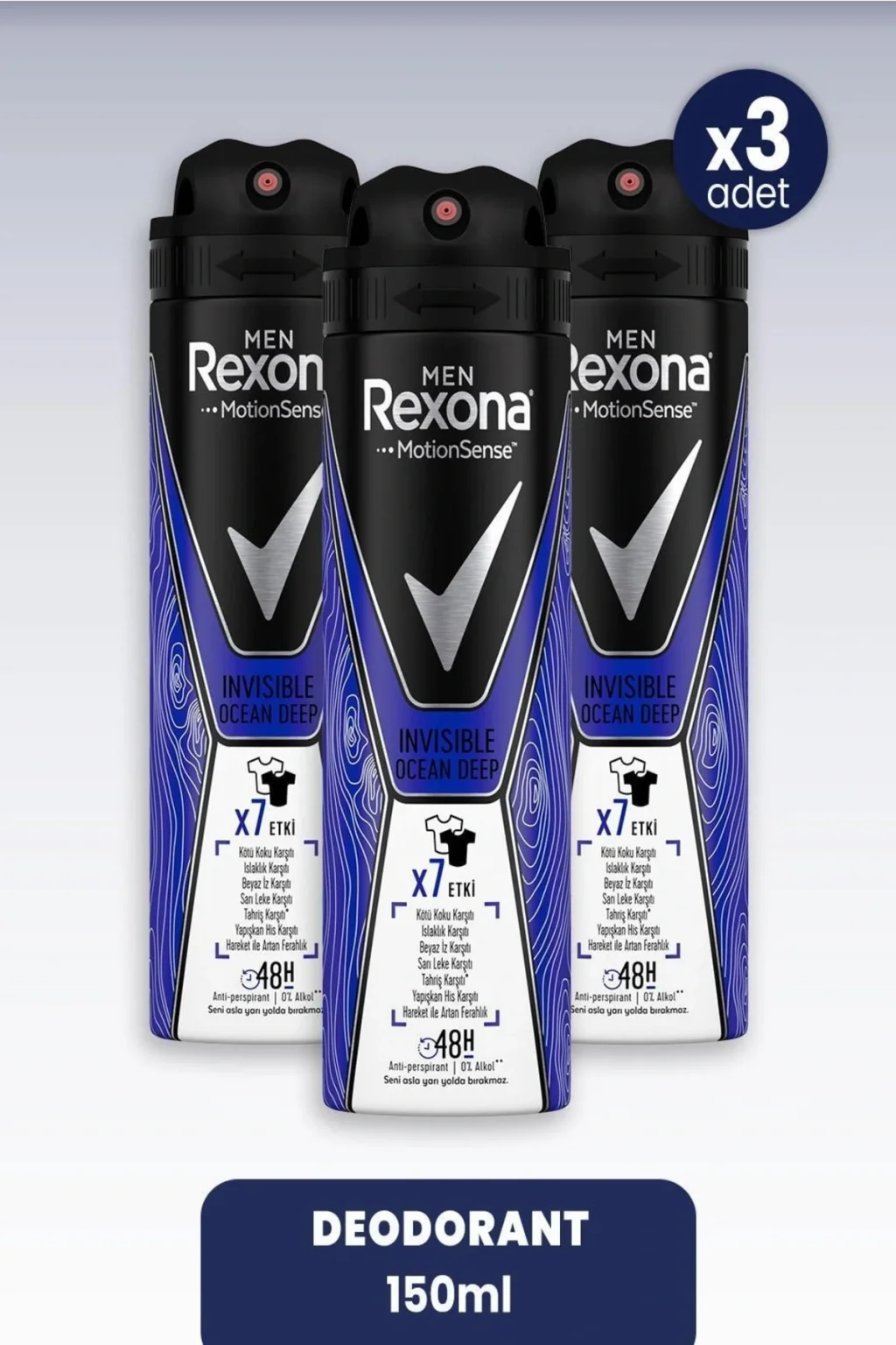 Rexona Men Sprey Deodorant Invisible Ocean Deep 150 ml x 3 Adet, Rexona’dan devrim niteliğinde bir yenilik! Rexona’nın 10 yılda geliştirilen patentli üstün teknolojisi ile Rexona Men Invisible Ocean Deep Antiperspirant Erkek Sprey Deodorant şimdi 72 saat boyunca ter kokusu ve ıslaklığa karşı kesintisiz koruma . ; Ter kokusu ve terden kaynaklı ıslaklık sebebiyle yoğun günlerde özgüvenle hareket edemiyor musunuz?Yenilenen Rexona deodorant ile tüm gün özgürce hareket etmenin tadını çıkarın çünkü Rexona Men Invisible Ocean Deep Antiperspirant Erkek Sprey Deodorant ile okyanus ferahlığı 72 saat boyunca sizinle. ; En hareketli günlerinizde bile ferah kalmanıza yardımcı olan yeni Rexona Men Invisible Ocean Deep Antiperspirant Erkek Sprey Deodorant, aynı zamanda kıyafetlerinizde iz bırakmaz. ; Bu erkek deodorantı, siyah giysilerde beyaz iz ve beyaz giysilerde sarı lekeye sebep olmaz. ; Rexona anti-perspirant deodorant ile en sevdiğiniz siyah tişörtünüzü veya beyaz gömleğinizi her zaman çekinmeden giyebilirsiniz. ; İş yerinde, sporda ve her yerde Rexona Men Invisible Ocean Deep Antiperspirant Erkek Sprey Deodorant 150 ml ter kokusuna karşı yanınızda. ; Erkek deodorant önerisi arayanlar için muhteşem yenilik!Bu sprey deodorant, her hareketinizde en büyük destekçiniz olacak ve üstün koruma sağlayacak. ; Okyanus ferahlığı veren kokuya sahip yeni Rexona Men Invisible Ocean Deep’in devrim niteliğindeki patentli mikroteknolojisi sayesinde özgüvenle ve özgürce hareket etmekten korkmayın. ; İçindekiler: Butane, Isobutane, Propane, PPG-14 Butyl Ether, Cyclopentasiloxane, Aluminum Sesquichlorohydrate, Parfum, C12-15 Alkyl Benzoate, Disteardimonium Hectorite, Glycine, Aqua, Calcium chloride, Octyldodecanol, BHT, Helianthus Annuus (Sunflower) Seed Oil, Propylene Carbonate, Dimethiconol, Maltodextrin, Sodium Starch Octenylsuccinate, Hydrolyzed Corn Starch Octenylsuccinate, Silica, Citric Acid, Citronellol, Coumarin, Isoeugenol, Limonene, Linalool.;