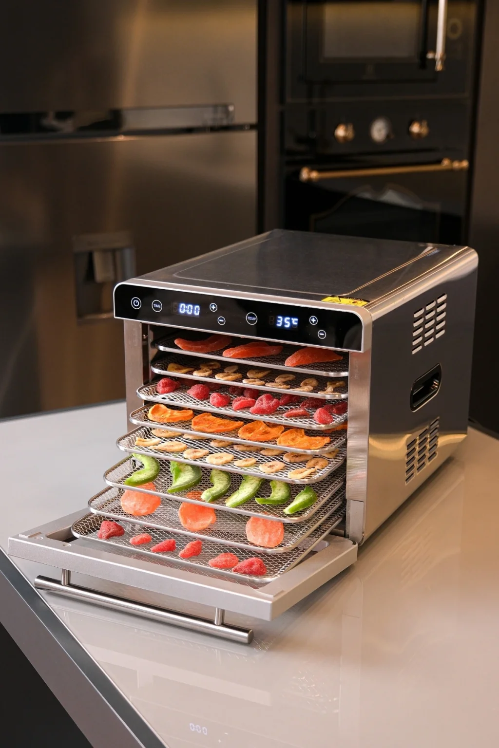- Geniş iç hacmi sayesinde 0 - 20 litre kapasiteye kadar meyve ve sebzeleri kolayca kurutabilirsiniz.; - Resmi distribütör garantisi ile güvenilir kullanım ve satış sonrası destek sağlar; 2 yıl süreyle güvence altındasınız.; - Turbo pişirme özelliği sayesinde, meyve ve sebzelerinizi eşit ve hızlı bir şekilde kurutarak besin değerlerini korur.; - İki farklı pişirme fonksiyonu ile farklı meyve ve sebzeler için özelleştirilebilir kurutma deneyimi sunar.; - Şık siyah tasarımı ve modern temasıyla mutfak dekorasyonunuza estetik bir dokunuş katar.; Resmi distribütör garantisi ile güvenli alışverişin keyfini çıkarın; 2 yıl süreyle herhangi bir sorun karşısında yanınızdayız; Modern tasarımı ve şık görünümüyle mutfak dekorasyonunuza estetik bir dokunuş ekler; Turbo pişirme özelliği sayesinde meyve ve sebzelerinizi hızlı ve eşit bir şekilde kurutarak lezzetini artırır; 8 adet geniş tepsi kapasitesiyle birden fazla meyve ve sebze kurutma işlemini aynı anda gerçekleştirebilirsiniz;