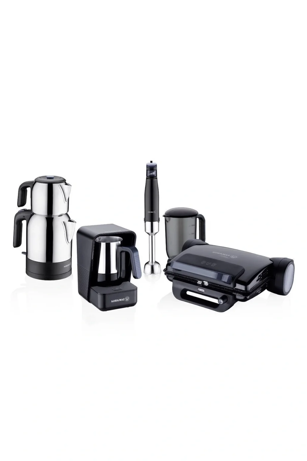 A863-02 - Korkmaz Moderna Siyah-Gri Parlak Kahve Makinası 400W verimli enerji tüketimi ; 5 fincan kahve kapasitesi; Otomatik kahve yapma ve hazır olduğunda kapanma; Paslanmaz çelik cezve; Taşma önleyici sensör; Susuz kaldığında otomatik kapanma sistemi; Tek tuşla kolay kullanım; Köz Tadında Moderna, diğer kahve makinelerinden tamamen farklıdır. “Lezzetli bir Türk kahvesinin sırrı kısık ateşte pişmesidir.”Harlı ateşte hızlıca kaynayan kahve özünü almadan pişer, bu durumda Türk kahvesi çiğ kaldığı için barındırmış olduğu lezzeti aromasını kahveye katamaz. Termo Balans Teknolojisi ile tasarlanan Moderna, daha düşük güçte çalışır ve kahve çekirdeğinin aromasını koruyarak köz tadında lezzetli kahveler yapar. Mutfakta kullanılan en sağlıklı materyal olan çelik cezve ile pişen kahveye hiçbir şekilde plastik, alüminyum gibi materyaller temas etmez. A448 - Korkmaz Performix Blender Set 1000 Watt ; Isıya dayanıklı, paslanmaz çelik öğütücü çubuk ; Tetiklemeli hız ayarı ; Yıkanabilme kolaylığı ; Öğütme fonksiyonları ; Gövde ve öğütücü çubuğun ayrılabilme özelliği ; Mandal sistemi ile kilitleme özelliği; 4 Bıçaklı; Performix, Tetiklemeli hız ayarı ve ısıya dayanıklı paslanmaz çelik öğütme çubuğu ile mutfakta yemek hazırlarken parçalama ve öğütme işlerinde en büyük yardımcınız olacak. A359 - Korkmaz Demkolik Inox/Siyah Elektrikli Çaydanlık Ölçüler: Demlik Kapasitesi: 0.9 lt Isıtıcı Kapasitesi: 1.8 lt Kapasite Bardak Sayısı: 20 Bardak 1600 Watt; 18/10 Cr-Ni paslanmaz çelik; Enerji tasarrufu ; Sıcak tutma fonksiyonu ; Susuz kaldığında otomatik kapanma özelliiği ; Ergonomik tasarım, güveli kullanım ; Otomatik sıcak tutma ve kaynatma ; Otomatik kaynatma butonu; Otomatik sürekli sıcak tutma butonu; 360° dönebilen kablosuz besleme ünitesi; A810-05 - Korkmaz Tostema Siyah/Gri Midi Tost Makinesi 1800 W; 4 adet tost ekmeği kapasiteli; Otomatik termostat kontrolü; Yağın kolay akmasını sağlayan özel ızgaralar; Kademeli ısı ayarı; Isı kontrol göstergeleri; Korkmaz Tostema, otomatik ısı kontrolü ve granit görünümlü ızgara sayesinde yalnız gerekli olan enerjiyi harcar.; Izgaraları kolayca sökülüp temizlenebilir.; Çok maksatlı pişirme ve kızartma özelliklerine sahiptir.; Izgaralar yanmaz - yapışmaz granit efektli PTFE kaplama olduğundan yiyecekleriniz bu yüzeylere yapışmaz.; Sandviç, tost ve ızgara yapma özelliklerine sahiptir.; Korkmaz Tostema ile ister leziz tostlar, isterseniz ızgara özelliğiyle et ya da balık hazırlamak mümkün. Kolay bastırma özelliği ile yorulmadan yiyeceklerinizi hem yağsız hem de sağlıklı bir biçimde pişirmenize yardımcı oluyor.