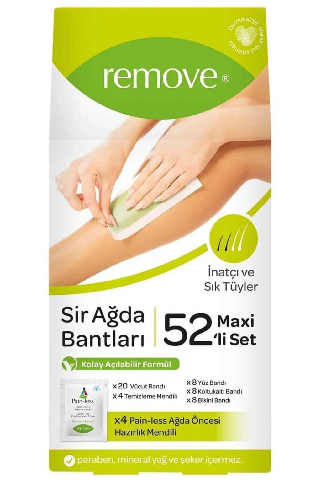 Remove sir ağda bantları 1,5mm'ye kadar kısa, kalın ve inatçı tüylerde bile 4 haftaya kadar süren etkisi ile yumuşak ve pürüzsüz bir cilde sahip olmanızı sağlar. ; "hassas ciltler", "normal tüyler" ve "inatçı ve sık tüyler" için olmak üzere 3 çeşidi bulunan bantlar vücut, yüz, koltuk altı ve bikini bölgelerine göre 4 farklı ölçüde şekillendirilmiştir. Bu özelliğiyle yüzeye göre kullanım kolaylığı sağlayan remove sir ağda bantları kutu içeriğinde 20 vücut, 8 yüz, 8 koltuk altı ve 8 bikini bandının yanı sıra 4 pain-Less ağda öncesi hazırlık mendili ve 4 remove ağda sonrası temizleme mendili vardır. ; Remove'a özel olarak doğal bitkisel yağlardan ve bitki özlerinden geliştirilen formülüyle daha güvenli ve stressiz ağda deneyimi sunan pain-Less ağda öncesi hazırlık mendili, ağda işlemi esnasında oluşan olumsuz hissin ve fiziki durumun, ağda işlemi sonrasında oluşabilecek kızarıklık ve tahrişin azalmasına yardımcı olur. ; Remove ağda sonrası temizleme mendili ile ciltte yapılan temizlik ve bakımla depilasyon süreci konforlu bir şekilde sonlandırılır. ;