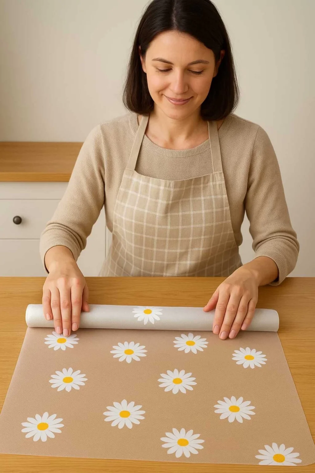 Papatya desenli mat yapısıyla göze hoş gelen bu astar, dolap içlerine ve çekmecelere kolayca uygulanabilir. 45cm genişliğinde ve 10 metre uzunluğunda olan bu ürünle istediğiniz ölçüde kesim yapabilirsiniz.