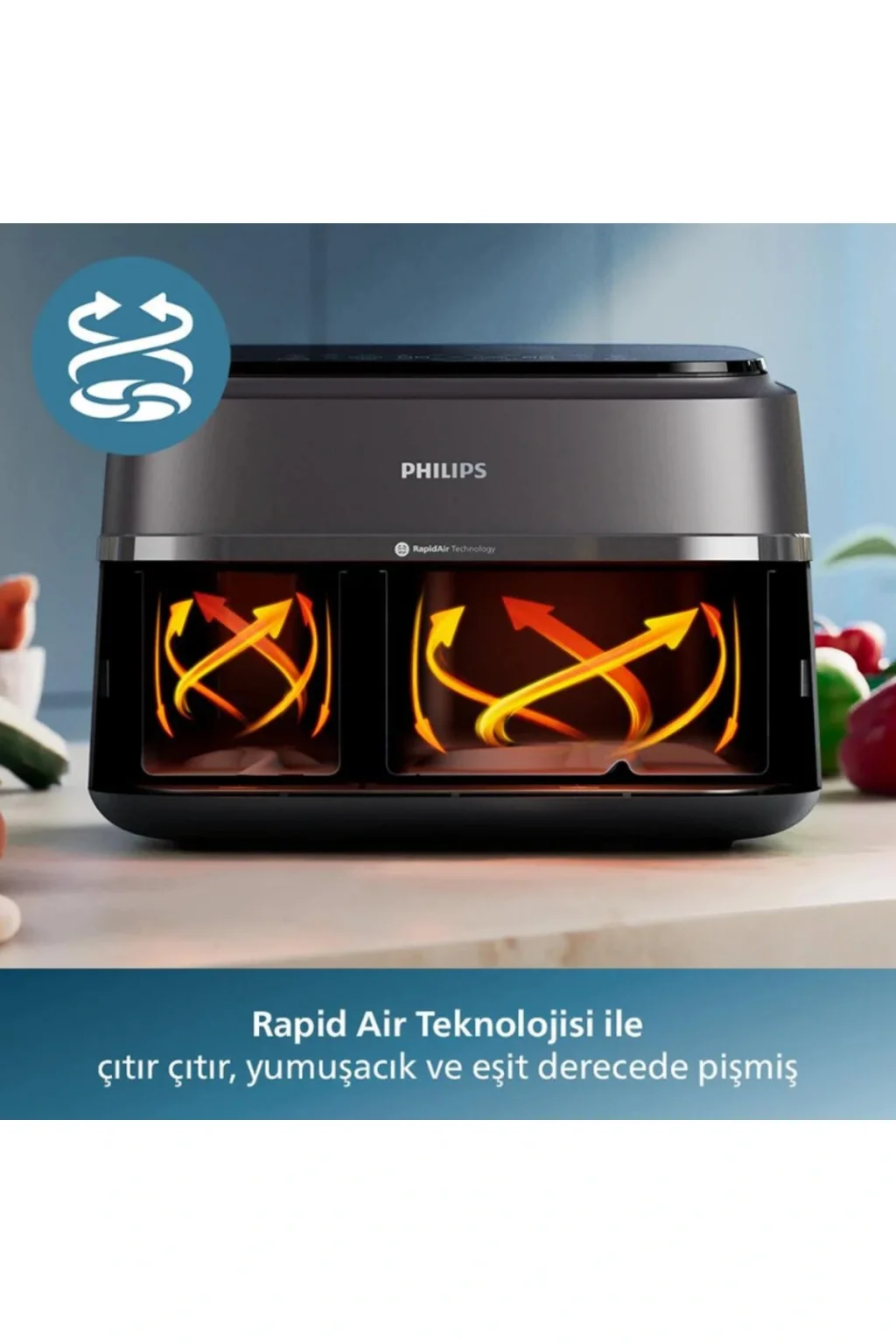 En iyi aile boyu Airfryer. Büyük haznede (6 Litre) tam bir tepsi yemeği hazırlayın; 1,5 kg'a kadar Brüksel lahanasını veya 1,5 kg tavuğu tek bir haznede pişirin.