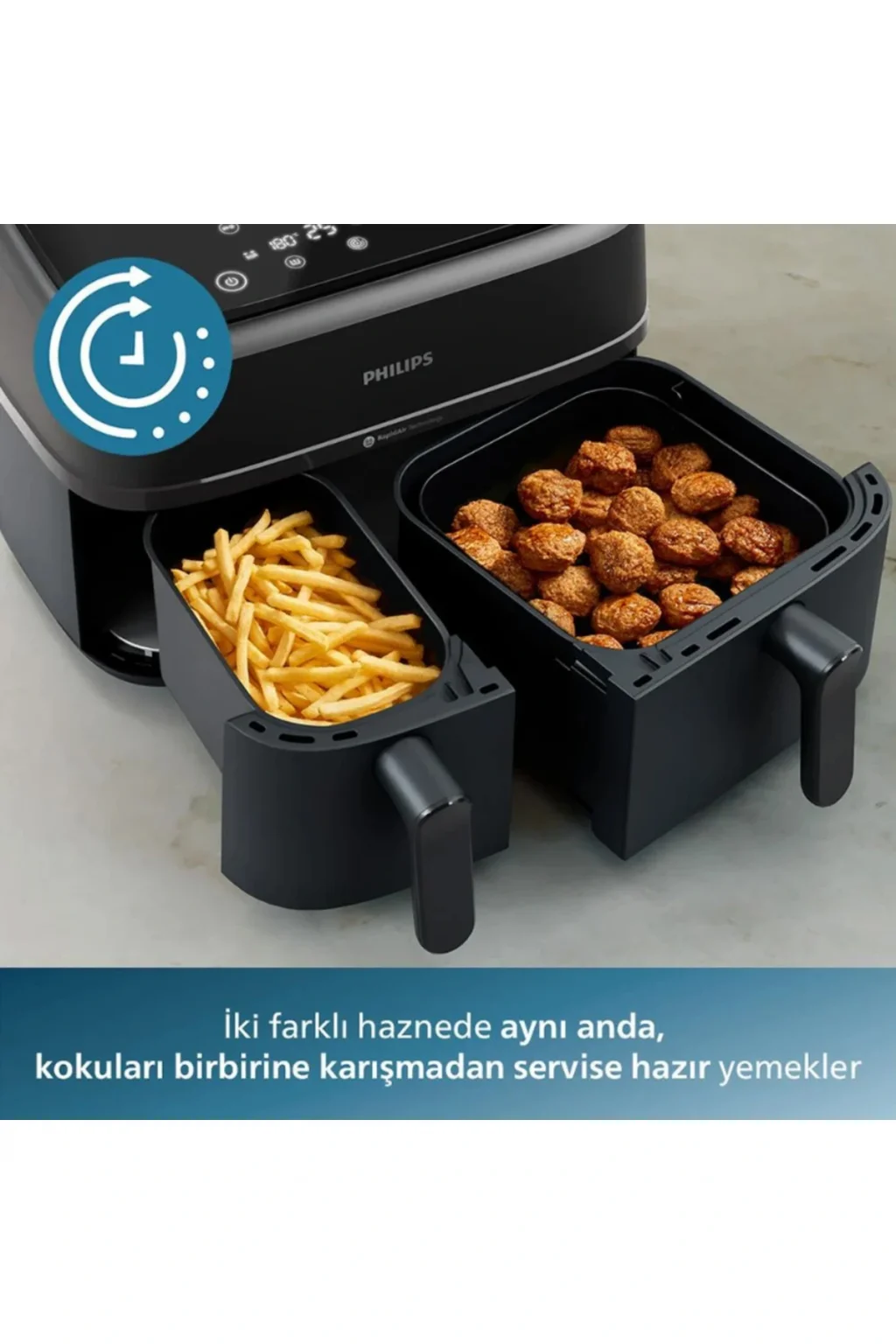 Çift hazneli Airfryer'lar: Büyük hazne (6 Litre), ana yemek, kızartma ve en sevdiğiniz yiyecekler için idealdir. Yan yemekler, sebzeler ve atıştırmalıklar için küçük hazneyi (3 Litre) kullanın.