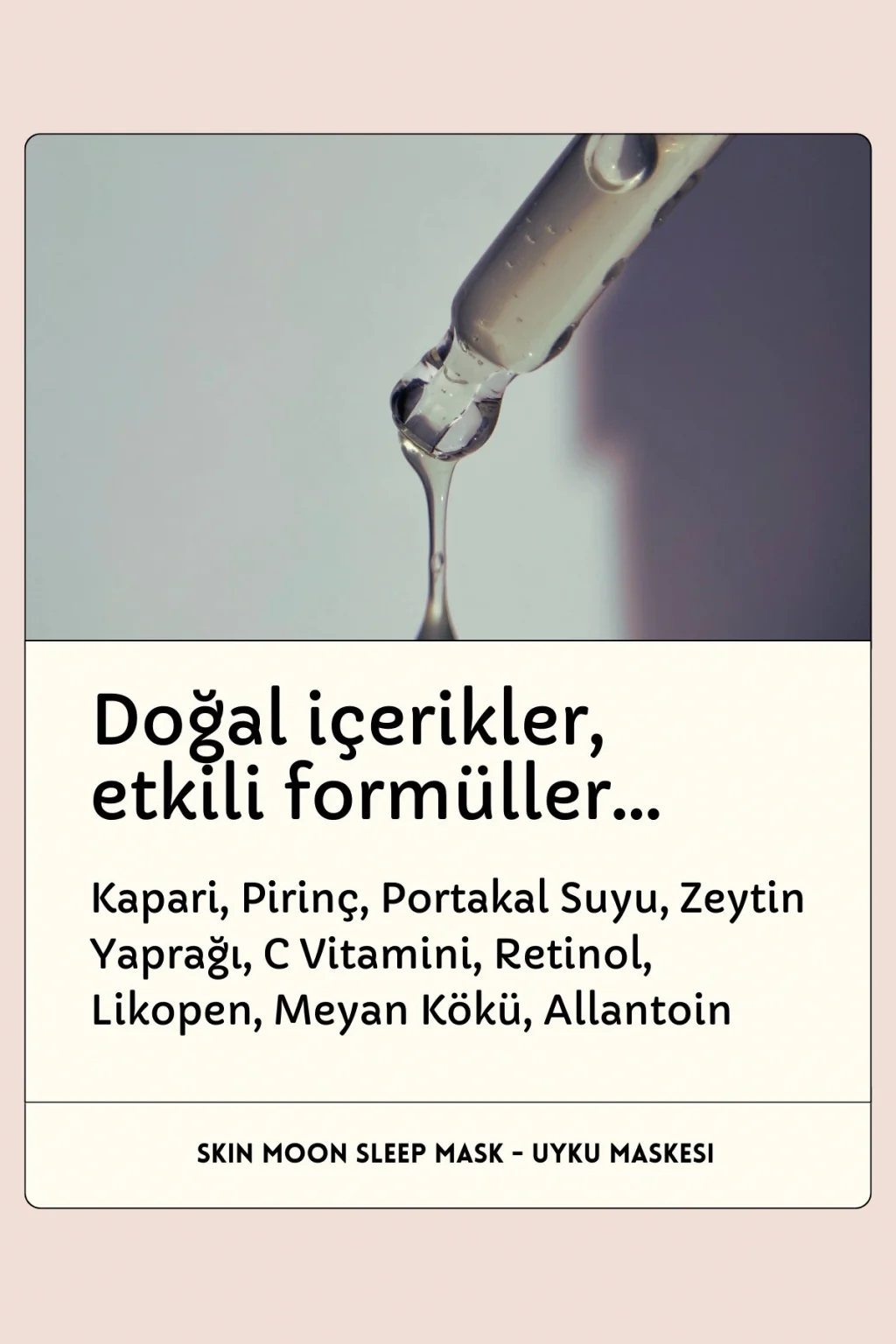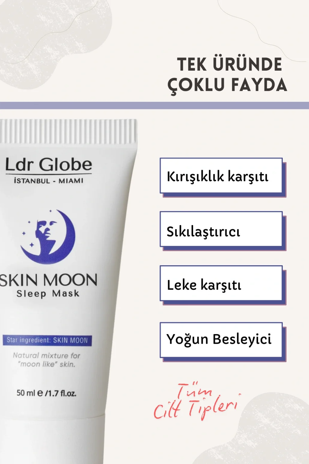 SKIN MOON Sleep Mask Gece Maskesi "Ay gibi" aydınlık cildinizin keyfini yaşayın! Gecelik güzellik sırrınız olan Uyku Maskesi Kremimizle tanışın; Bu lüks krem formundaki maske, gece boyunca cildinizi besleyerek ve nemlendirerek sihrini gerçekleştirirken rüyalar alemine sürüklenin; Cilt, en çok uyku sırasında kendini yeniler; Uyku vakti, cilde uygulanan bakımların en etkili çalıştığı zaman aralığıdır; (özellikle melatonin salgısının zirvede olduğu 23; 00; 04; 00 saatleri arası) Skin Moon Sleep Mask, uykunuz sırasında yoğun bir antiaging bakımı sunar; Özel bileşenler, Skin Moon, Retinol, Vitamin C, Vitamin E, Likopen, Buğday Ruşeymi ve Meyankökü içeren eşsiz formülü ile cildi nemlendirir, besler, canlandırır ve yatıştırır; Onarıcı, yenileyici, gençleştirici bakım bir arada; Yıldızlı ipucu: Uykudan önce ılık bir duş alın; Ardından cildinize uyku maskemizi uygulayın; İyi havalanmış, serin ve karanlık bir odada uykuya dalın; Sabah aynada kendinizi çok beğeneceksiniz! Tüm cilt tipleri için uygundur; Ambalaj: 50 ml tüp Kullanım: Uyumadan önce bol miktarda cildinize uygulayın; Durulamayın; Tek başına veya nemlendiriciden sonra uygulanabilir; Uygulama bölgesi: Yüz ve boyun Uygulama sıklığı: Günde 1 kez, uykudan önce Anahtar kelimeler: antiaging, leke karşıtı, antioksidan, nemlendirici, besleyici, bariyer güçlendirici Aktif içerikler: Skin Moon® (Kapari, Portakal, Pirinç, Zeytin yaprağı), Retinol, Panthenol, Likopen, C vitamini, E vitamini, Buğday tohumu, Meyan kökü, Allantoin İçerikler hakkında detaylı bilgi için tıklayın! Ldr Globe İçerik Deposu;