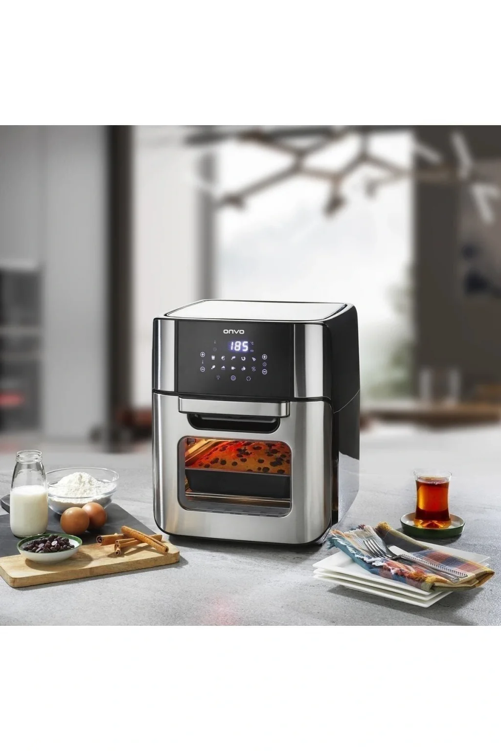 ONVO OVFRY09 OVEN AIR FRYER 12 LT 1800 W GÜÇ 12 LİTRE KAPASİTE 80; 200°C SICAKLIK ARALIĞI 1; 60 DK ZAMANLAYICI ARALIĞI YÜKSEK HIZLI HAVA SİRKÜLASYON TEKNOLOJİSİ KOLAY TEMİZLENEBİLEN İÇ HAZNE DOKUNMATİK DİJİTAL KONTROL PANELİ ÖN AYARLI 10 PİŞİRME MODU % 80’E KADAR DAHA AZ YAĞ KULLANIMI OTOMATİK KAPANMA HAZIR KONUMDA SESLİ UYARI DÖNEBİLEN KIZARTMA KAFESİ DÖNEBİLEN PİLİÇ ÇEVİRME APARATI KEK TEPSİSİ VE ÖZEL GÖZENEKLİ IZGARA TELİ;