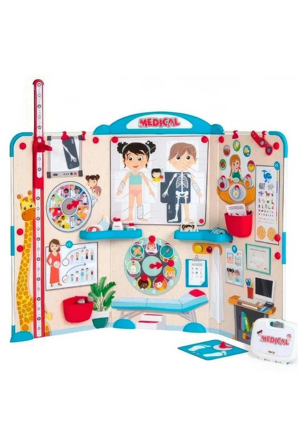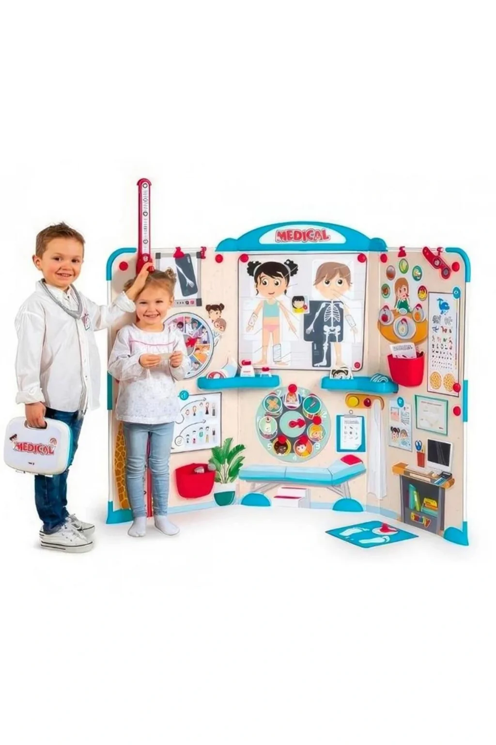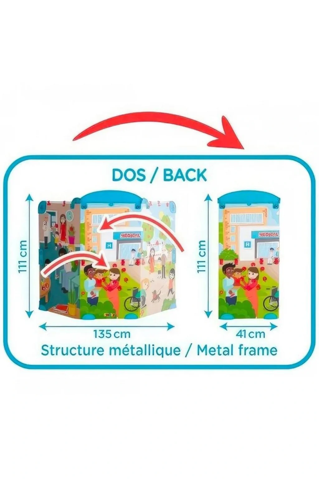 Smoby Oyuncak Pediatri Kliniği 340208 Smoby’den pediatri kliniği, sağlam bir metal çerçeve ile çevrili, yüksek kaliteli karton parçalardan yapılmış üç kanattan oluşur.; Entegre raflar ek denge sağlar ve geniş muayene aksesuarları yelpazesi için bol miktarda alan sunar.; Oynadıktan sonra, yerden tasarruf etmek ve kaldırmak için kolayca katlanabilir.; Farklı oyun alanları çok çeşitli oyun seçenekleri sunar (Hepsi Oyuncak): Radyoloji alanında, 5 X-ışınları analiz edilebilir veya yeniden iskelet oluşturmak için çocukların silüetlerine yerleştirilebilir.; Vücut parçası tanıma: burada çocuklar çeşitli tıbbi yardımcıları Velcro ile bağlayabilirler.; Beslenme alanı: Küçük hastalar gün içinde yediklerini üzerlerinde yemek bulunan küçük kartlar yardımıyla gösterebilirler.; Göz testi: Her iki göz de bir kart ve oyun gözlüğü yardımıyla görme ve renk tanıma açısından test edilebilir.; Ölçüm çubuğu yardımıyla 1,20 m'ye kadar vücut boyu belirlenebilir.; Farklı tedavi düzeyleri için ayarlanabilir tekerlek.; Hastanın ağırlığını kaydetmek için oynatılabilir ölçek.; Fransa'da yüksek kaliteli malzemeden yapılmıştır.