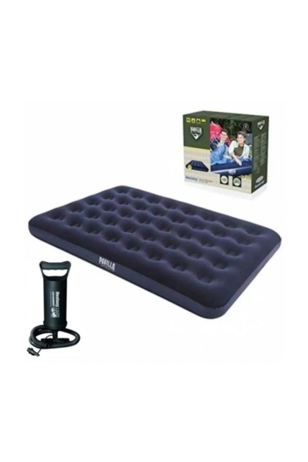 İki kişiye rahatça konfor sağlayan çift kişilik tasarımıyla, pavillo şişme yatak her gece keyifli bir uyku deneyimi sunar.; Üreticinin güvenilir markası BESTWAY tarafından üretilen bu ürün, kalitesiyle ön plana çıkar.; Pompa dahil olması sayesinde ekstra ekipman ihtiyacını ortadan kaldırarak pratik kullanım imkanı sağlar.; Lacivert rengiyle şık ve modern bir görünüm sergileyen bu yatak, dış mekan aktivitelerinizde de stil sahibi olmanızı sağlar.; Nemli bir bez ile kolayca temizlenebilir yapısı sayesinde bakımı oldukça basittir; böylece uzun süreli hijyenik kullanım mümkün olur.