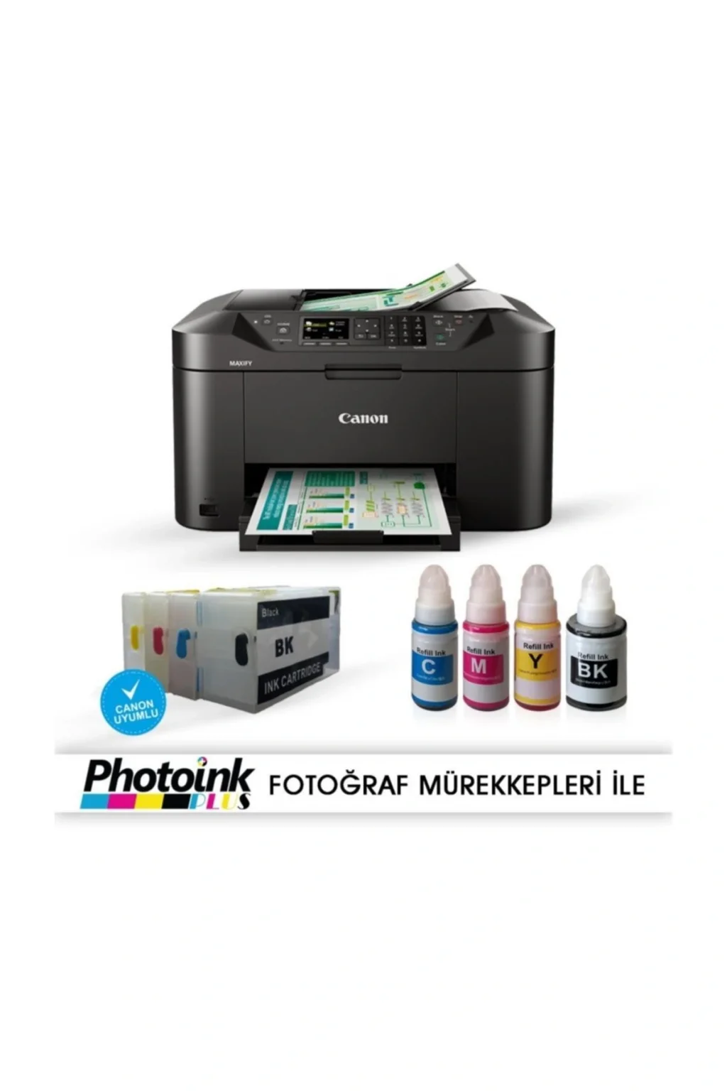 Canon Maxify MB2150 Yazıcı ve Kolay dolan Kartuş Sistemi (Renkli Yazıcı, Tarayıcı, Fotokopi, dublex ve wifi) Sayfa başına son derece düşük bir maliyet ile mükemmel renkli ve mono baskı kalitesine ihtiyaç duyan hane büroları için tasarlanmış çok istikametli yazıcı, faks, tarayıcı ve fotokopi; 250 sayfalık geniş bir besleyici ve 50 sayfalık otomatik belge besleyici ile Canon MAXIFY MB2150 Serisi, işaretleyici ve sürtünmeye dayanıklı DRHD mürekkeplerini kullanarak canlı renkler ve net metinler ile olağandışı baskılar üretir; Canon Maxıfy MB2150 Serisi, hızlı bir 19 ipm mono ve 13 ipm renkli A4 boyutunda baskı yaparken ilk sayfa çıkış müddeti (FPOT) yalnızca 6 saniyedir; Google Cloud Print, Apple AirPrint (iOS), Mopria ve Canon PRINT uygulaması, buluttan yazdırırken ve Google Drive, Dropbox, Evernote, OneNote, OneDrive ve Concur dahil olmak üzere belgeleri popüler bulut servislerine tarama ve kaydetme gibi desteklenmektedir; Erişim Noktası modu, akıllı cihaz kullanıcılarının Wi; Fi ağı olmadan da yazıcıya bağlanabileceği anlamına gelir; IP adresi filtreleme, yalnızca belirli sayıda kullanıcıya erişim hakkı sağlarken, SMTP desteği bir ofis ağında güvenli e; postaya izin verir; Sistem yöneticileri yazıcıyı hızlı ve kolay bir şekilde yapılandırabilir ve USB'ye tarama gibi belirli işlemleri kısıtlayabilir; Sistem yöneticileri, yazıcıyı mevcut ofis ağlarına entegre etmeyi kolaylaştıran bir cihaz yönetim standardı olan Canon Maxify MB2150 Serisinin Basit Ağ Yönetimi Protokolü (SNMP) uyumluluğunu takdir edeceklerdir; SNMP, mürekkep seviyeleri, hata durumu ve sayfa sayısı gibi bir dizi bakım izleme işlevi sağlar; PAKET İÇERİĞİ:; Canon MB2150 Tek Fonksiyonlu Yazıcı; 4 Renkli 1500XL Kolay Dolan Kartuşlar; 4 Renk PHOTO INK Mürekkepleri (2 adet; 135 ml siyah ve 70'şer ml 3 renk); USB Kablo ve Yazıcının CD vs; tüm aparatları ÖNEMLİ NOT : Bu yazıcı yanında kartuşlar gönderilmemektedir; Lütfen buna dikkat edin Önemli not: Yazıcı 2 yıl yada "emici dolu" hatası verene kadar garantilidir; Ayrıca Yazıcı içindeki orjnal kafaların da garantisi yoktur MAXIFY MB2150 Mobil cihazlar ve bulut hizmetleri için baskı ve tarama desteği sunan, 19 ipm siyah beyaz baskı hızına ve çeşitli ağ özelliklerine sahip olağanüstü çok işlevli mürekkep püskürtmeli renkli yazıcı, tarayıcı, fotokopi makinesi ve faks; Faydalar Hızlı baskı: 19 ipm siyah beyaz, 13 ipm renkli Doğrudan mobil cihazlardan baskı almak için Wi; Fi ağına bağlanma Bulut hizmetlerinden baskı alın ve buluta tarama yapın 1200 sayfa siyah beyaz ve 900 sayfa renkli baskı düzeyinde mürekkep verimlilikleri Üretkenliği koruyun: 250 yapraklık kapasite ve 50 yapraklık ADF GENEL BAKIŞ Özet Ev; ofisler için kompakt Hepsi Bir Arada Fonksiyonlar Baskı, Fotokopi, Tarama, Faks, Wi; Fi Cloud Link YAZICI ÖZELLİKLERİ Yazdırma Hızı (yaklaşık) 19,0 ipm siyah beyaz A4¹ 13,0 ipm renkli A4¹ İlk Sayfa Çıkış Süresi (yaklaşık) Siyah Beyaz: 6 sn; (hazır) / 10 sn; (uyku) Renkli: 7 sn; (hazır) / 14 sn; (uyku) Baskı Teknolojisi Mürekkep püskürtmeli, FINE baskı kafası Maksimum Baskı Çözünürlüğü 600 x 1200 dpi Baskı Kenar Boşlukları (min; ) Üst: 3 mm, Alt: 5 mm, Sol ve Sağ: 3,4 mm 2 Taraflı Baskı Otomatik (A4, LTR düz kağıt) TARAYICI ÖZELLİKLERİ;