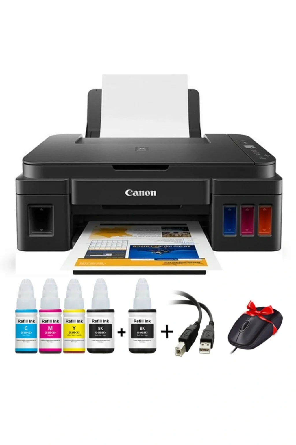 Canon pıxma g2415 orjınal tanklı (forprint plus mürekkepli) yazıcı (canon g2411 yerine üretilen üst model) (1 adet siyah mürekkep + mouse + usb kablo hediye ) Paket içeriği: Canon g2415 çok fonksiyonlu yazıcı 2 adet orjinal kartuşları 4 renk toplam 345ml forprint plus mürekkepleri 1 adet 135ml forprint plus siyah mürekkep hediye Yazıcının cd vs. ; Tüm aparatları Usb kablo hediye Mouse 'hediye ( mouse görseli temsilidir everest marka kablolu veya kablosuz olarak gönderim sağlanmaktadır ) Not : Yazıcı ile birlikte orjinal mürekkepler gönderilmemektedir. ; Genel özellikler Baskı türü fotoğraf baskı Baskı hızı dakikada 11 sayfa siyah - 9 sayfa renkli Baskı çözünürlük 4800 x 1200 dpi Kağıt kapasitesi (giriş) 50 sayfa Kağıt kapasitesi (çıkış) 50 yaprak Desteklenen kağıt boyutu a4 (210 x 297 mm) Tarama türü cıs renkli tarayıcı renkli tarama var Tarama çözünürlük 2400 dpi Fotokopi özelliği var Fotokopi çözünürlük 600 x 1200 dpi Fotokopi adedi 20 sayfa Faks özelliği yok Faks hafıza yok Işlemci belirtilmemiş Çift taraflı baskı yok Aylık çalışma kapasitesi aylık maksimum 20.000 sayfa Bellek belirtilmemiş Usb var Paralel yok Ethernet (lan) yok Wi-Fi yok Kran ebatı satır lcd Kart okuyucu yok Sarf malzeme 2 kartuş Işletim sistemi windows Ağırlık belirtilmemiş Garanti 24 ay garanti;