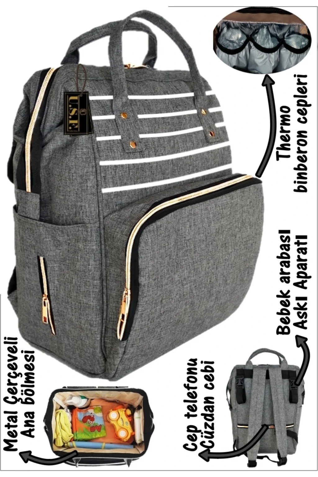 Portbebe özellikleri ; Sağlam ve ortopedik yapısıyla bebeğiniz için hem korunaklı hem de kullanışlı bir üründür. ; Üst kısımda bebeğin yüzünü korumak için fermuarlı bir bölüm bulunmaktadır. ; Yumuşak bir iç kısma sahiptir. ; Etrafı süngerli olup bebeği dışarıdaki etkilere karşı korur. ; Taşımak için uygun uzunlukta ve güçlendirilmiş askıları vardır. ; Bebek sağlığına zararlı hiçbir madde içermez. ; Su sıvı ve rüzgar geçirmez yapıdadır. ; Ölçüler: Uzunluk: 70 genişlik: 30 yükseklik: 33 ; Bebek arabası asma aparatı mevcuttur ; Kaliteli kumaş ve sağlam dikişlerle bebek bakım çantanız ; Çantamızın ana bölümünde 4 adet malzeme gözü ve 1 adet fermuarlı saklama cebi bulunmaktadır ; Çantamızın ön bölümünde 3 adet thermo özellikli biberon gözü (2-4 saate kadar soğuk & sıcak tutabilir) ve 1 adet ekstra cep bulunmaktadır ; Çantamızın sağ tarafında büyük boy biberon cebi bulunmaktadır ; Çantamızın sol tarafında 60/72 li ıslak mendil yerleştirme cebi vardır. ; Çantamızda toplam 14 adet farklı kullanım için cep bulunmaktadır. ; Çantamızın arka kısmında tablet,cep telefonu ve cüzdan saklama için fermuarlı büyük kolay ulaşım cep bulunmaktadır.. ; Su ve sıvı geçirmez kumaştan üretilmiştir. ; Çantamızın hiçbir yerinde bebeğinizin sağlığına zararlı bir madde kullanılmamıştır. ; Silinebilir kumaş ; ölçüler: (yükseklik: 42 cm) x( genişlik: 28 cm) X ( en: 20 cm )