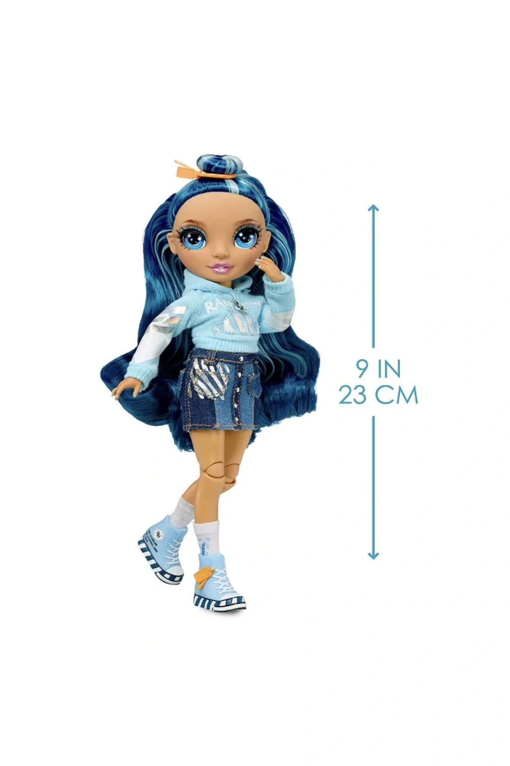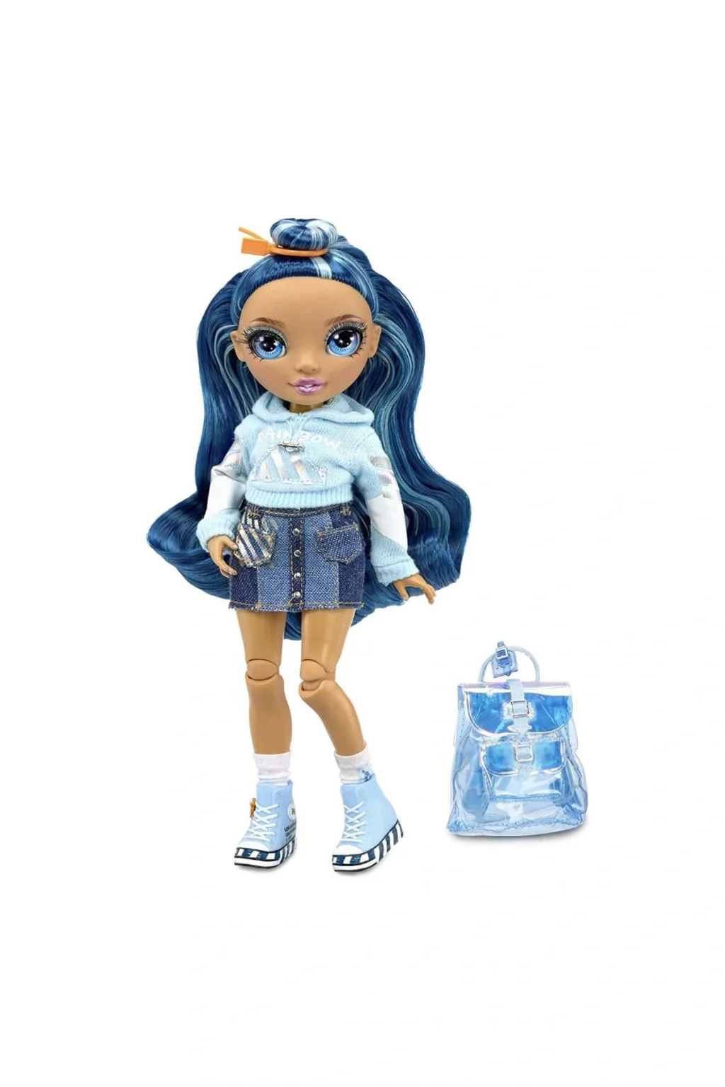 L.; O.L.; Rainbow High Jr.; High S1-Skyler Bradshaw 580010 En sevdiğiniz Rainbow High bebeklerinin genç versiyonlarıyla gerçek rengin parlasın ! Rainbow High karakterlerimizin Rainbow High öğrencisi olmadan önce yaratıcı tutkularını nasıl bulduklarına dair kendi köken hikayeleri var.; Bu hikayeleri keşfetmeye hazır mısın ? Skyler, genç yaşta bir moda tasarımcısı olmayı hayal etmiş ve Jr.; High'da ""yılın en iyi yaz kıyafeti ilham kaynağı"" olarak adlandırdığı elbiseyi tasarlamıştır.; Skyler, yaratıcılığın bir anda ortaya çıkabileceğini biliyor.; Bu sebeple yaratıcı temellerini taşımak için sırt çantasını almadan evden asla çıkmıyor.; Skyler Bradshaw, tepeden tırnağa imzası olan MAVİ renk kıyafetleri ile, muhteşem bir genç yüz yapısına sahip,güzel uzun mavi saçları, uzun kirpikleri ve cam gözleri olan mükemmel bir Rainbow bebeğidir.; Açılan ve kapanan yumuşak kumaş holografik yanardöner mavi vinil sırt çantası ve saç tokasını saklamak için mükemmel bir aksesuar setin içerisinde bulunur.; Özellikleri : • Rainbow High bebeklerin daha genç versiyonu • 23 cm boyunda bir adet bebek • Yeni genç yüz yapısı • Sevimli ve güzel, tamamen eklemli bebekler • İmza renginde, benzersiz kıyafet • Fırçalanabilir uzun saçlar,saç aksesuarları ve tarak • Oyuncak bebek oyun seti şunları içerir: Bir adet RH Junior High bebeği, tam bir oyuncak bebek kıyafeti, bir çift oyuncak bebek ayakkabısı, bir çift çorap ve bebek aksesuarları - açılıp kapanan yumuşak kumaş sırt çantası, bir çift kelebek saç tokası ve oyuncak bebek tarağı.; 3 yaş ve üzeri için uygundur.